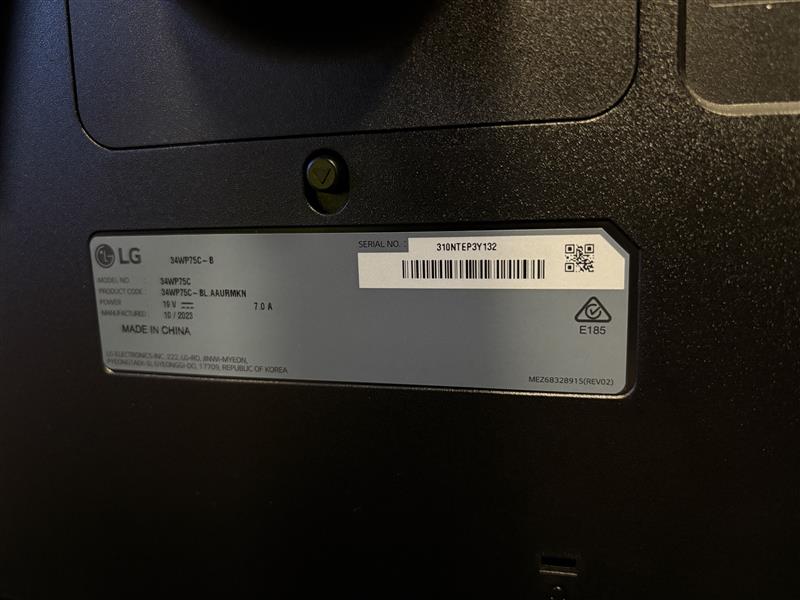 LG 34WP75C-B 34" Curved Ultrawide Monitor Model: 34WP75C-B Serial: 310NTEP9Y132 Connections include USB-C (upstream), DisplayPort, dual HDMI, two USB 3.0 ports, headphone jack, and DC power input. Manufactured 10/2023. Ports: USB-C (SS, upstream) USB-C 2 x USB 3.0 DisplayPort 2 x HDMI Headphone out DC power input Condition: Item is used. Screen surface shows minor marks from general use. Stand and rear casing have light cosmetic wear. Power Cords and other Adaptors are not included, Working Condition unknown