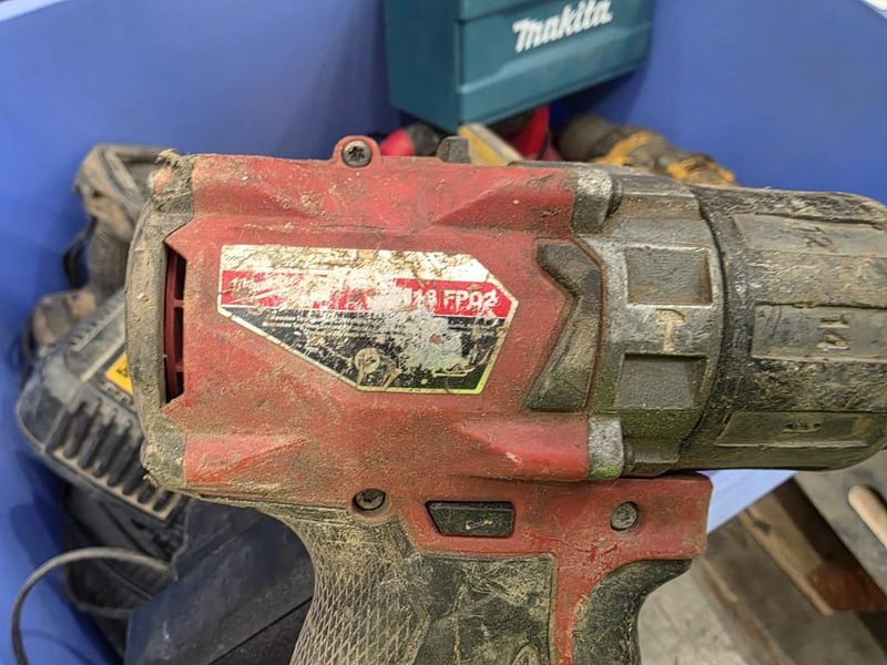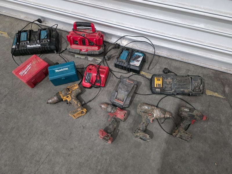 Assorted Lot of Power Tools and Accessories including Hammer Drill Driver, Combi Drill and battery charger stations. With Brands Such as Makita, Milwaukee, Bosch and Dewalt drills SOLD AS LOT