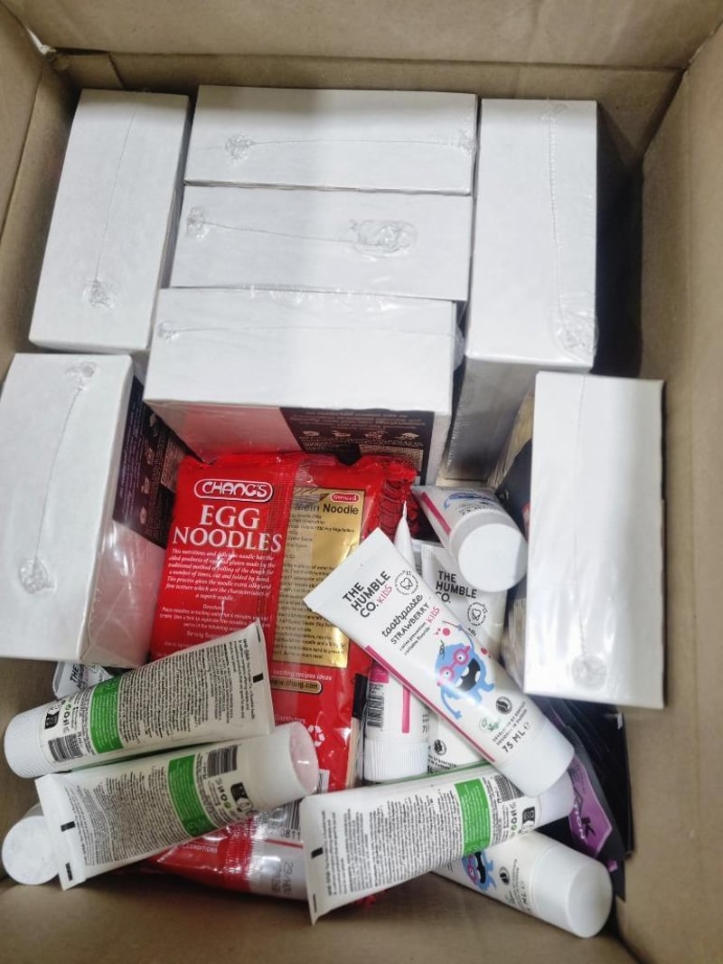 Assorted grocery items, includes body wash,egg noodles, pasta and more..... Sold as lot Note: No guarantees are made regarding product freshness, shelf life, or usability,- Bidders are advised to inspect and verify before.