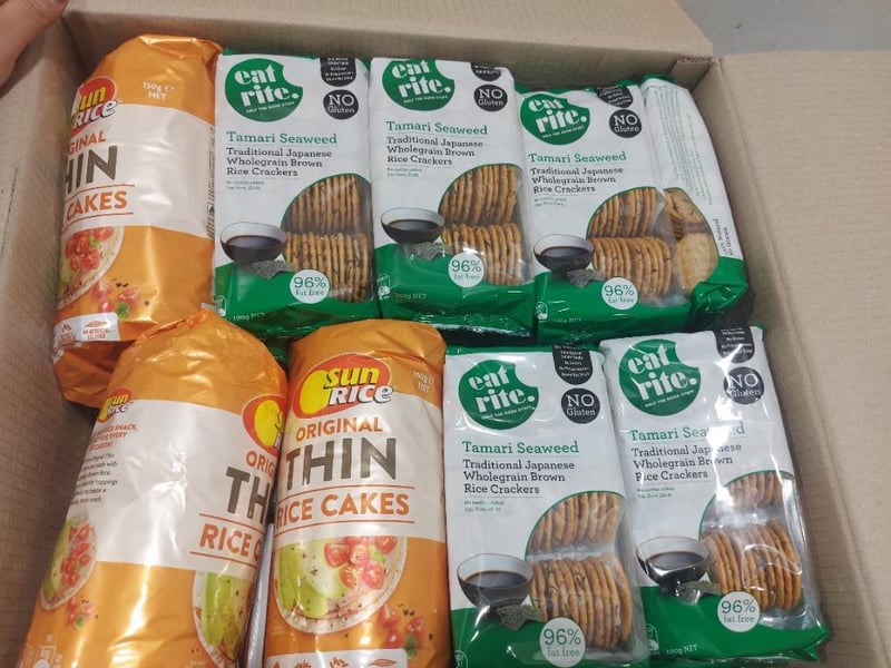 Assorted grocery items, including rice cakes, stock and more...Note: No guarantees are made regarding product freshness, shelf life, or usability,- Bidders are advised to inspect and verify before.