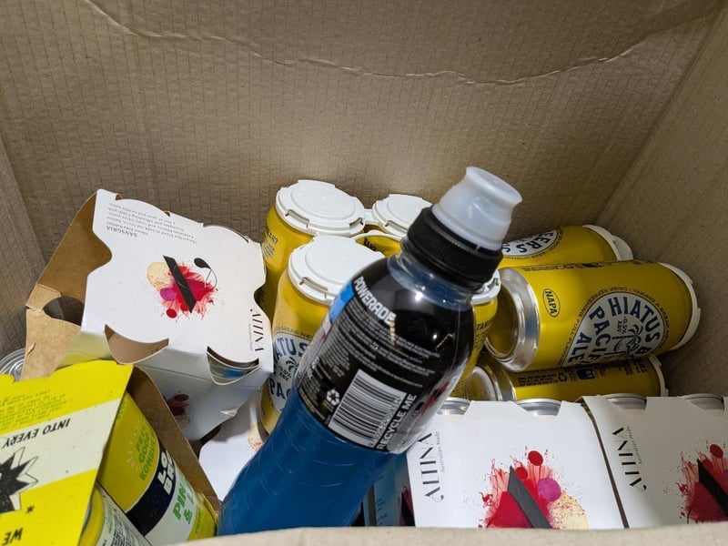 Assorted beverages, including hiatus beers Pacific ale, pineapple & lime kombucha and more...Note: No guarantees are made regarding product freshness, shelf life, or usability,- Bidders are advised to inspect and verify before.