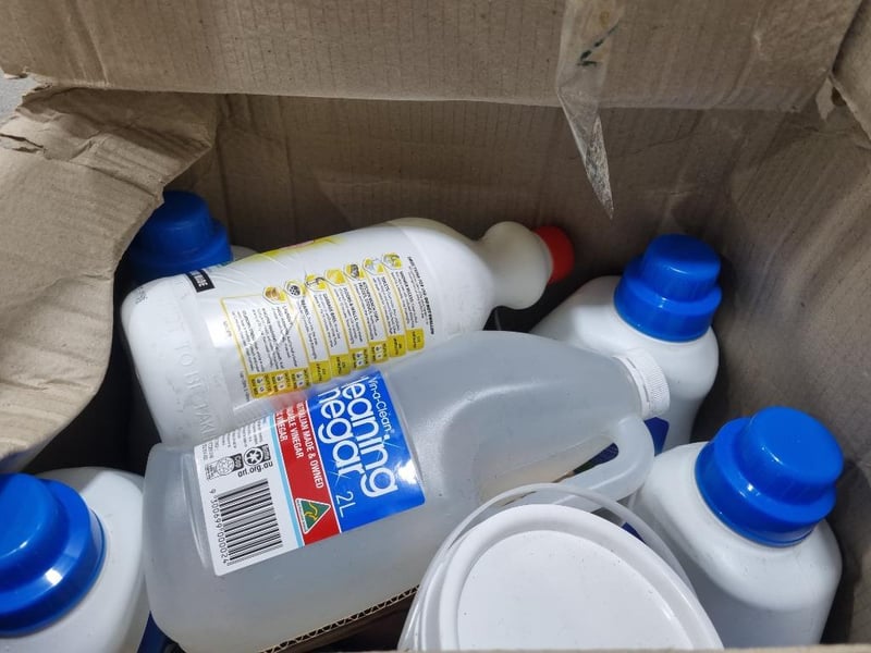 Assorted cleaning products, includes cleaning vinegar,white King premium bleach and more... Sold as lot Note: No guarantees are made regarding product freshness, shelf life, or usability,- Bidders are advised to inspect and verify before.