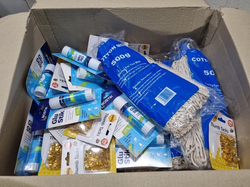 Assorted homeware lot,includes mop heads, glue sticks ,thumb tacks and more.... Sold as lotNote: No guarantees are made regarding product freshness, shelf life, or usability,- Bidders are advised to inspect and verify before.