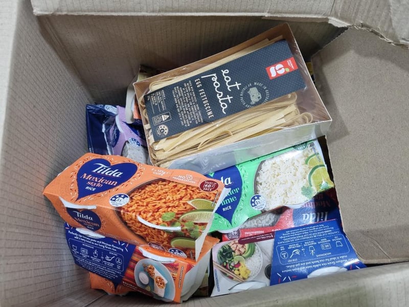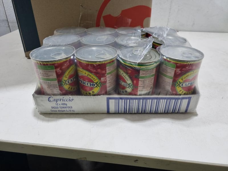 Assorted grocery items, canned tomatoes, packaged rice and packaged pasta. Sold as lotNote: No guarantees are made regarding product freshness, shelf life, or usability,- Bidders are advised to inspect and verify before.