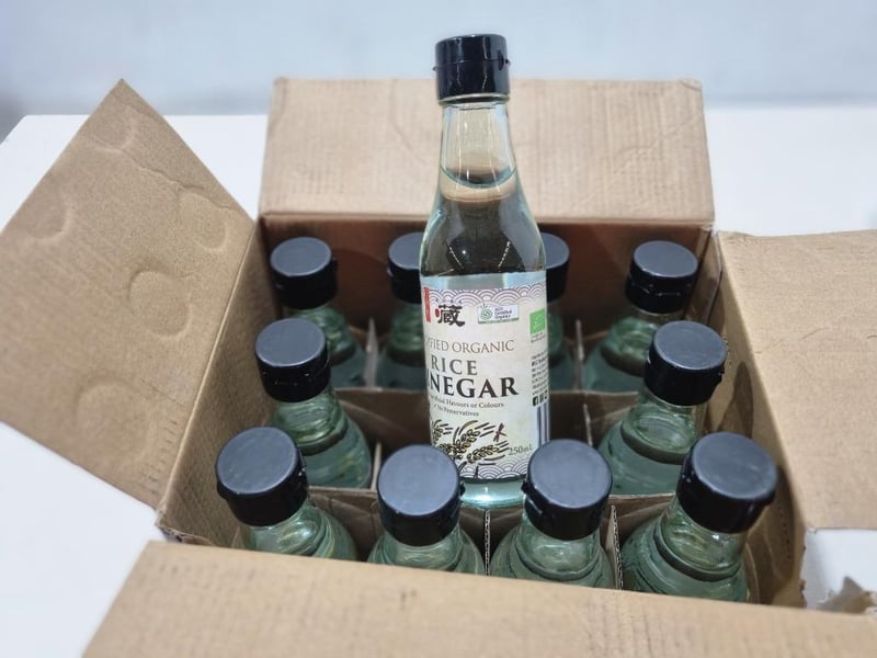 Certified organic rice vinegar, qty to lot.Sold as lot Note: No guarantees are made regarding product freshness, shelf life, or usability,- Bidders are advised to inspect and verify before.