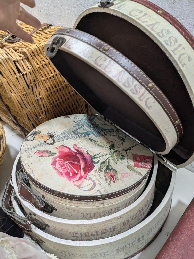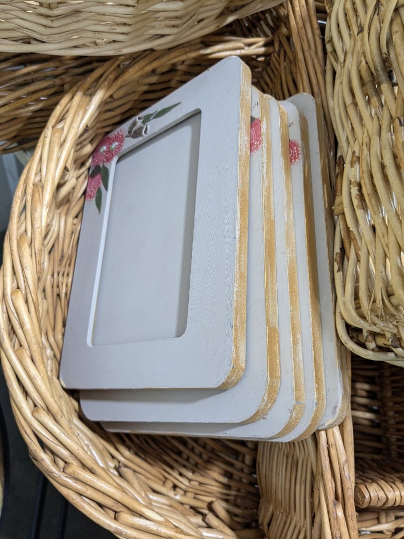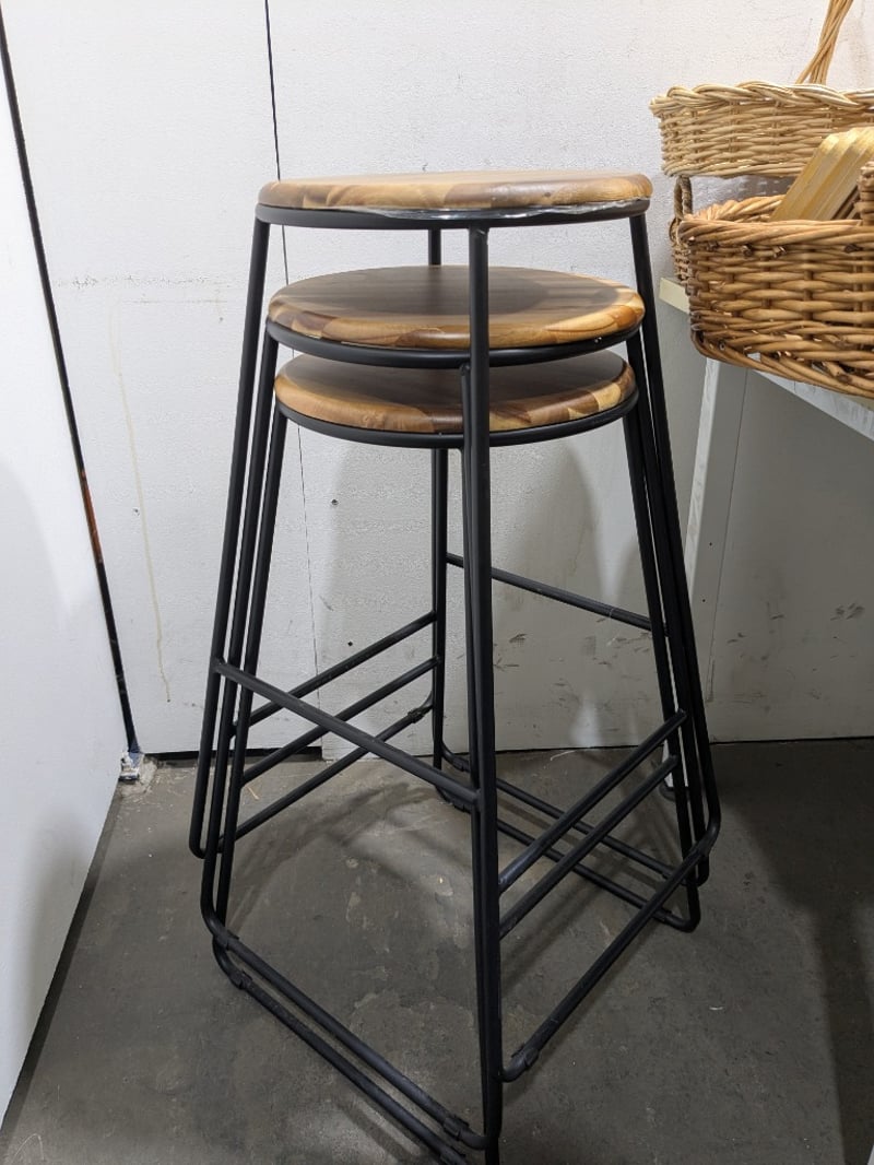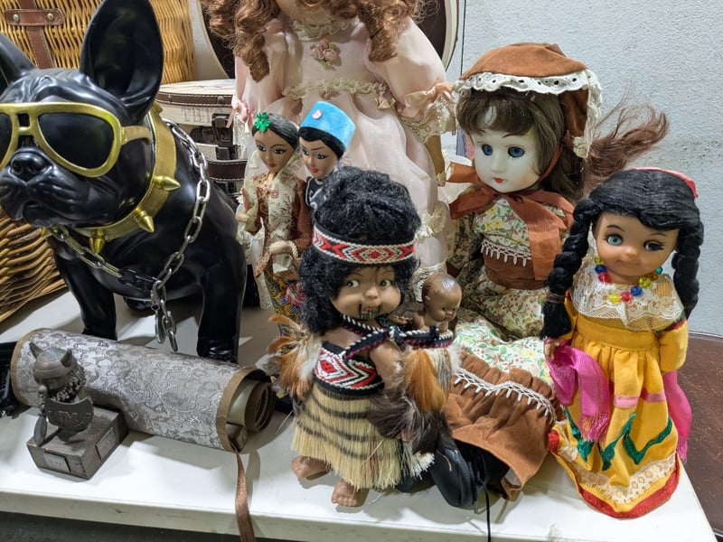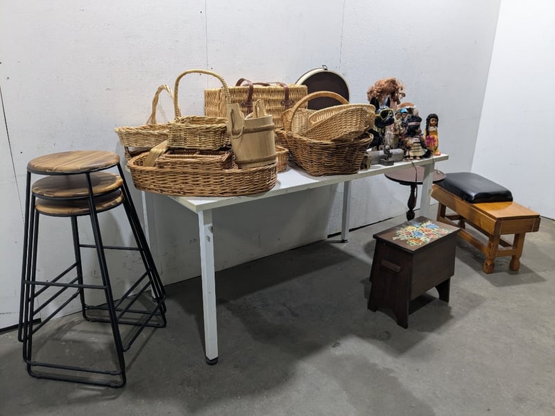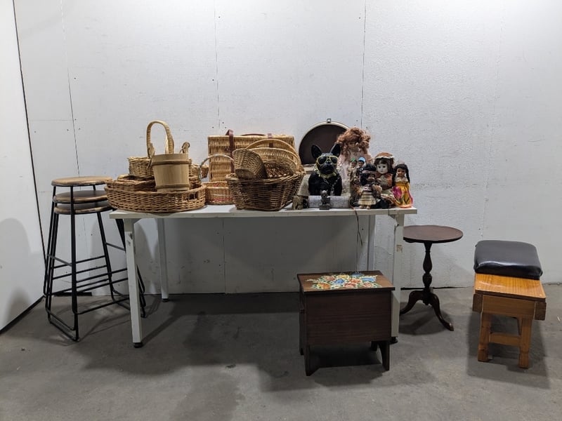 Assorted lot,includes, Cane baskets,dolls,Wooden stools with steel frames and more...