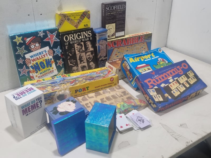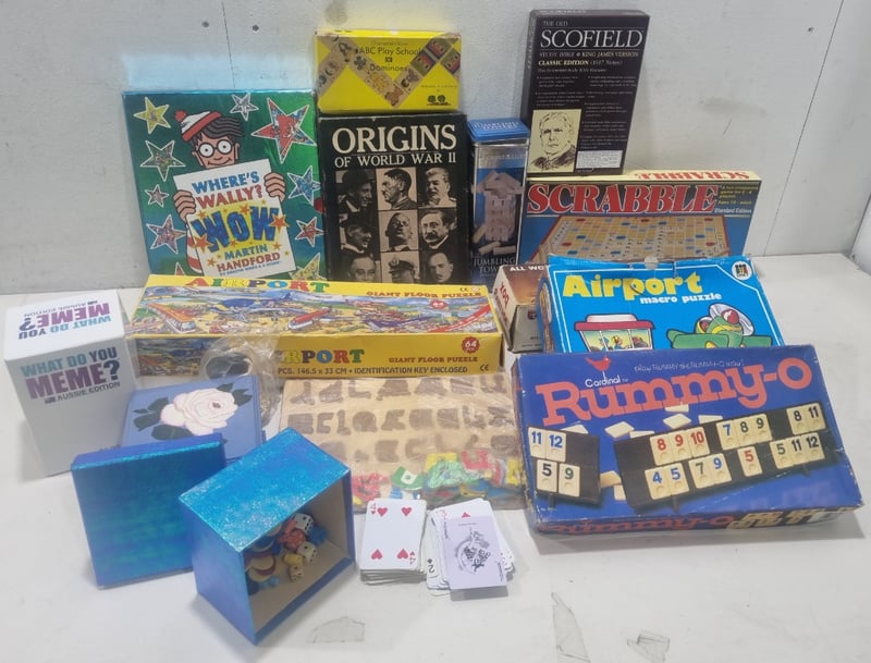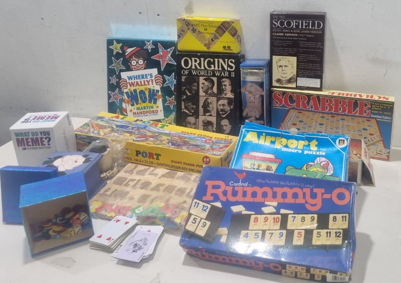 Assorted games and books,includes Where's Wally's,Scrabble,Rummy-O and more....