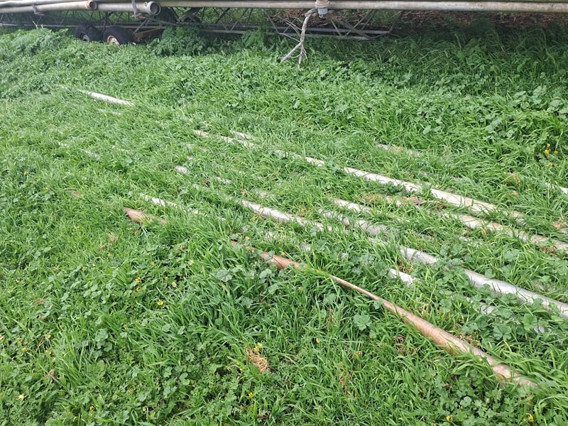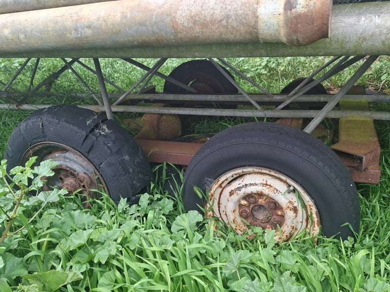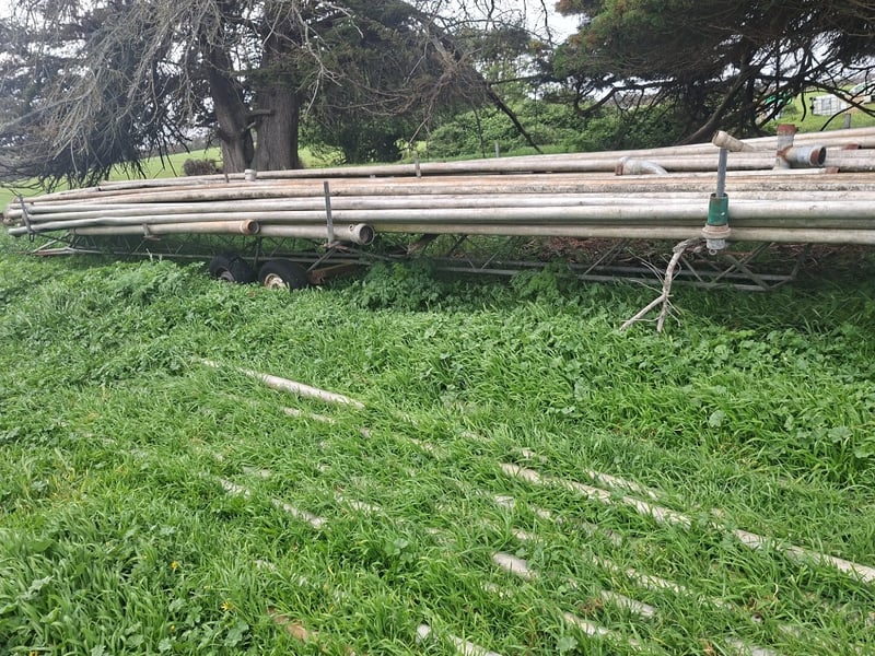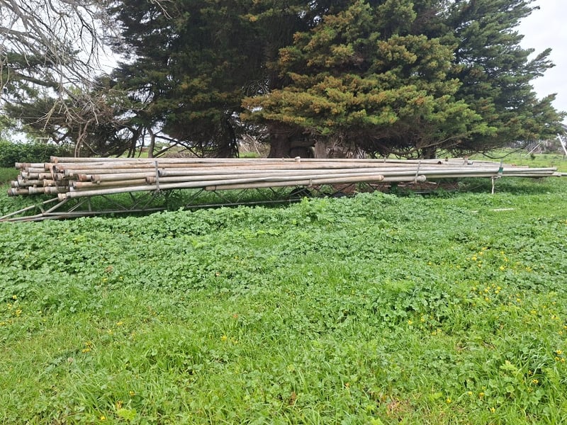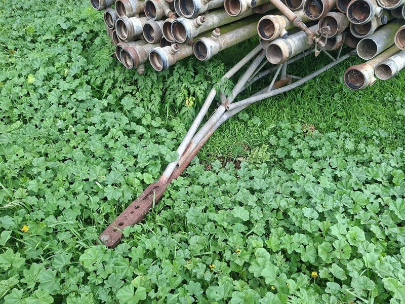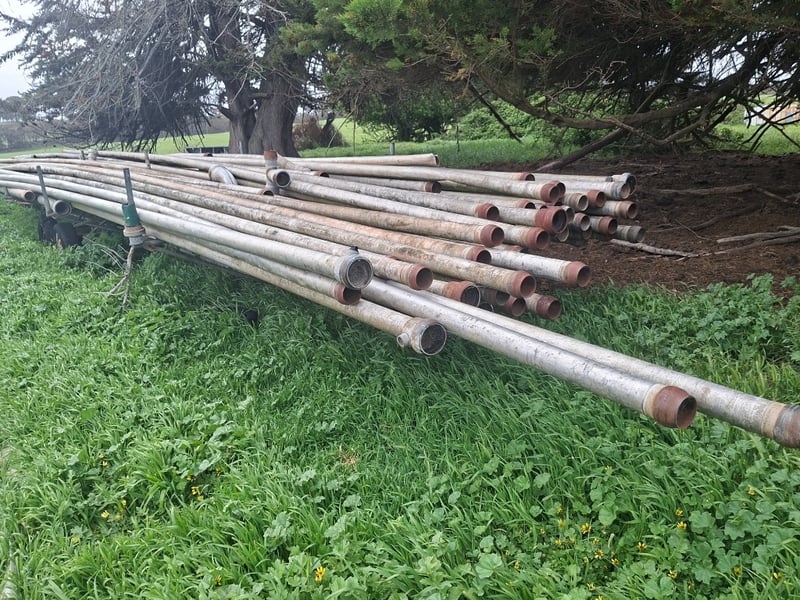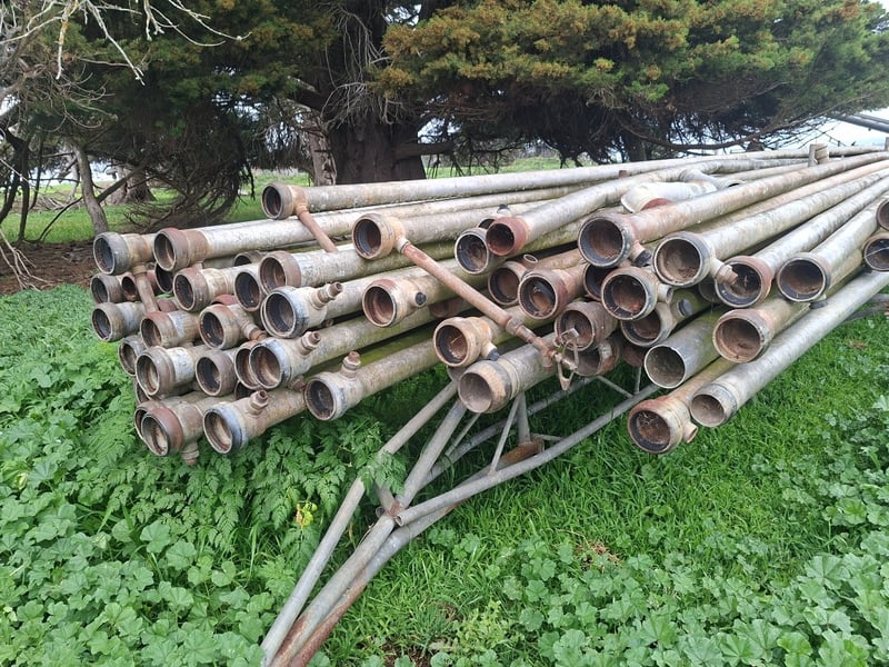 Irrigation Pipes – Steel with Quick-Connect Couplings Material: Galvanised Steel Length: Approx. 12 metres (each) Quantity: Approx. 35 - 40 pipes Fittings: Quick-connect couplings on each end Extras: Some pipes include sprinkler risers or valves still attached Condition: Good used condition with expected weathering.
