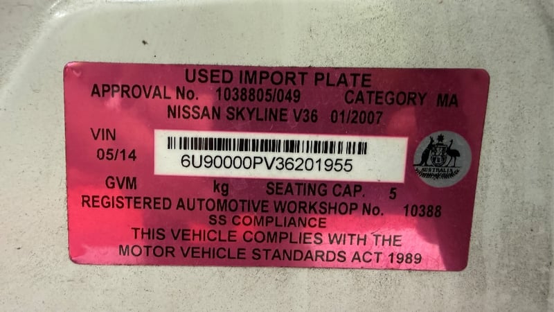 2007 Nissan Skyline V36 Year: 2007 Make: Nissan Model: Skyline Series: V36 Body: 4-Door Coupe Drive Type: Rear wheel drive Odometer: Indicating 168,663 Kilometres Engine: 3.5 V6 Petrol Transmission: 5-Speed Automatic Colour: White Description/extras: Exceptional 2007 Nissan Skyline V36 350GT sedan finished in elegant Pearl White with sophisticated black leather interior. This iconic Japanese performance sedan features a naturally aspirated 3.5-litre V6 engine producing impressive power delivery, paired with a smooth 5-speed automatic transmission driving the rear wheels. The vehicle displays 168,665 kilometres on the odometer and presents as a well-maintained example of Nissan's legendary Skyline lineage. Interior appointments include dual-zone climate control, premium audio system, leather-appointed seats with manual adjustment, and comprehensive instrumentation. The Skyline V36 represents the final generation of this storied nameplate, combining classic Japanese sports sedan aesthetics with modern refinement. This specimen has been imported to Australia and complies with Motor Vehicle Standards Act 1989 requirements. The vehicle demonstrates strong engineering credentials typical of the VQ35 engine platform, offering enthusiasts a refined alternative to contemporary sports sedans. Minor cosmetic blemish on roof panel, small paint chip on bonnet edge. Inspection recommended. VIN: 6U90000PV36201955 ENG No: VQ35532764C #PCV (Key #B26x2 Carrara) Lloyd's stock #1038750+1