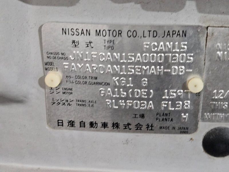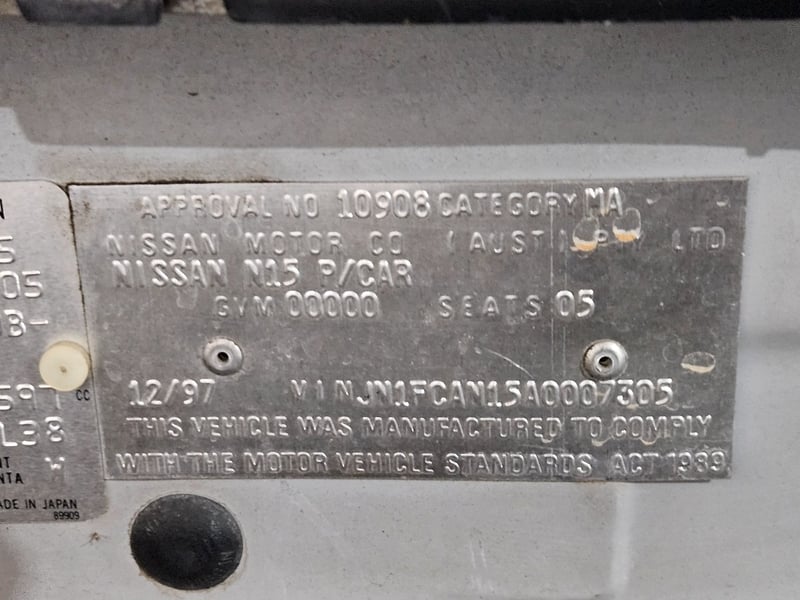 1997 Nissan Pulsar Year: 1997Make: NissanModel: PulsarBody: 4-Door HatchDrive Type: Front wheel driveOdometer: Indicating 218,749 KilometersEngine: 1.6 I4 PetrolTransmission: ManualColour: SilverSeats: 5Description/extras: Air Conditioning, Central locking, Owners manual. VIN: JN1FCAN15A0007305ENG No: GA16065245C#PCV(Key #A34)Lloyds stock #1039048+1