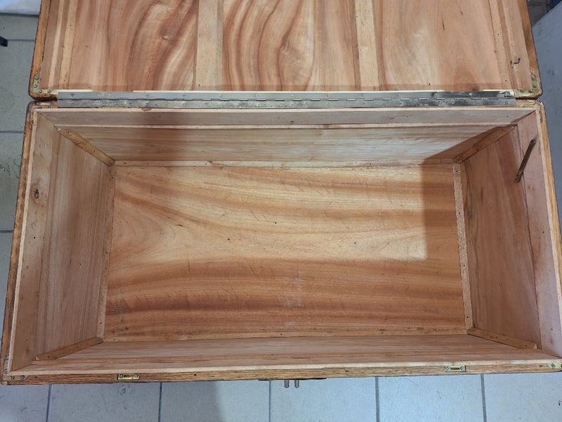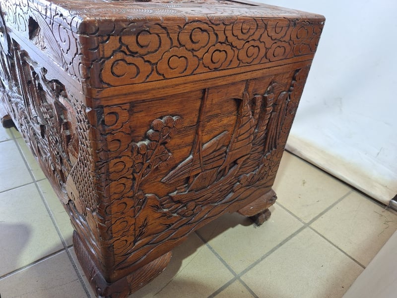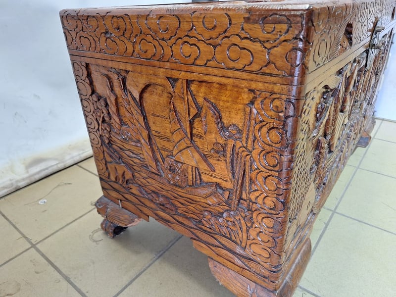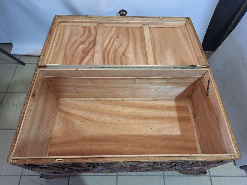 Chinese Hand-carved Camphor Chest, Timber Style, Brown FinishDimensions H:59cm W:100cm D:51cm
