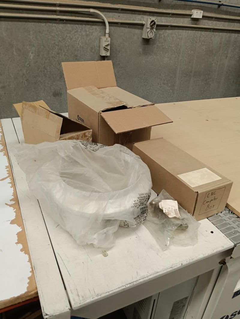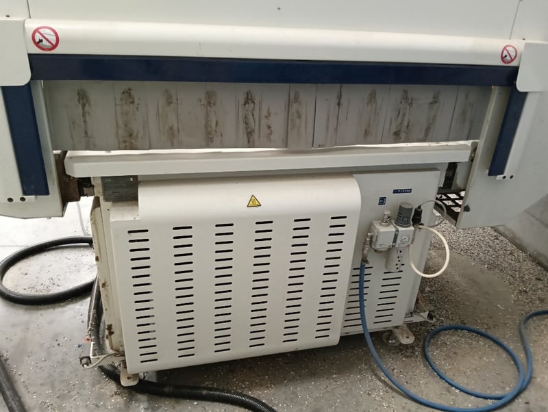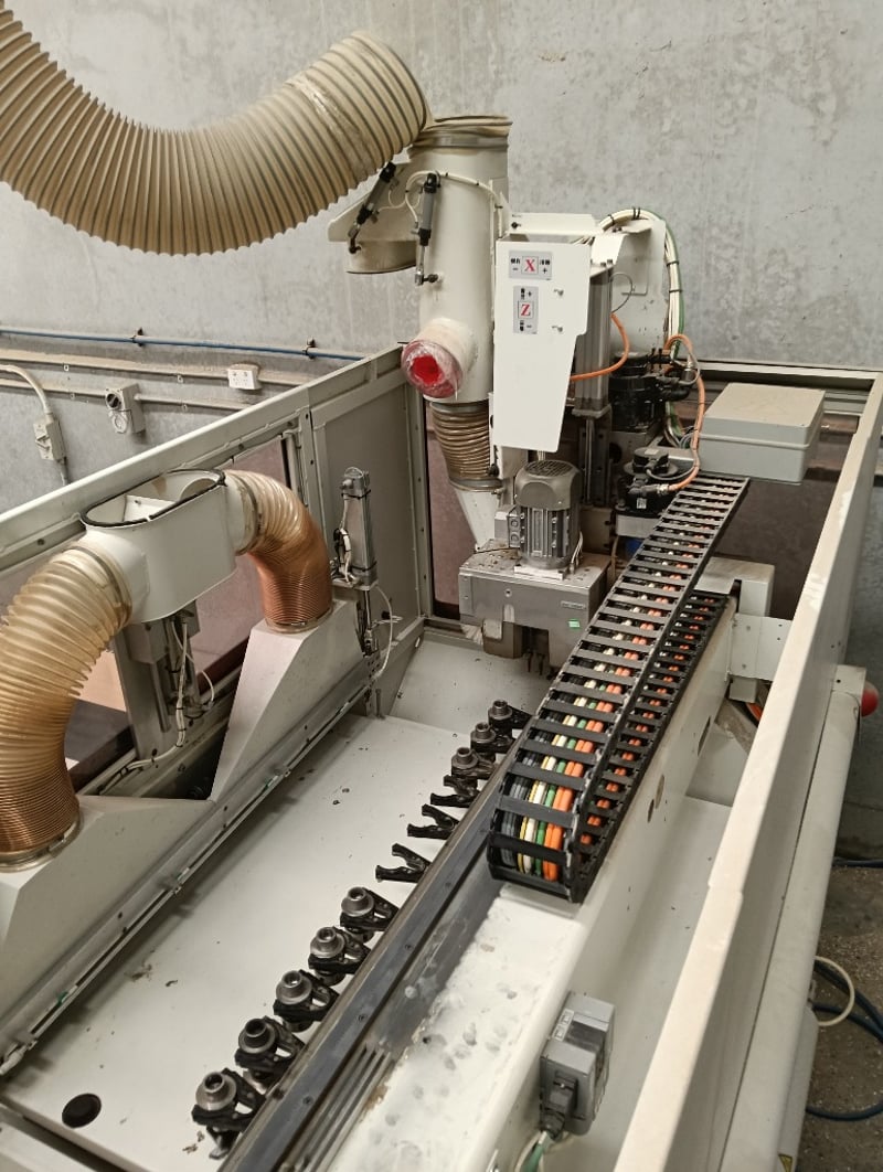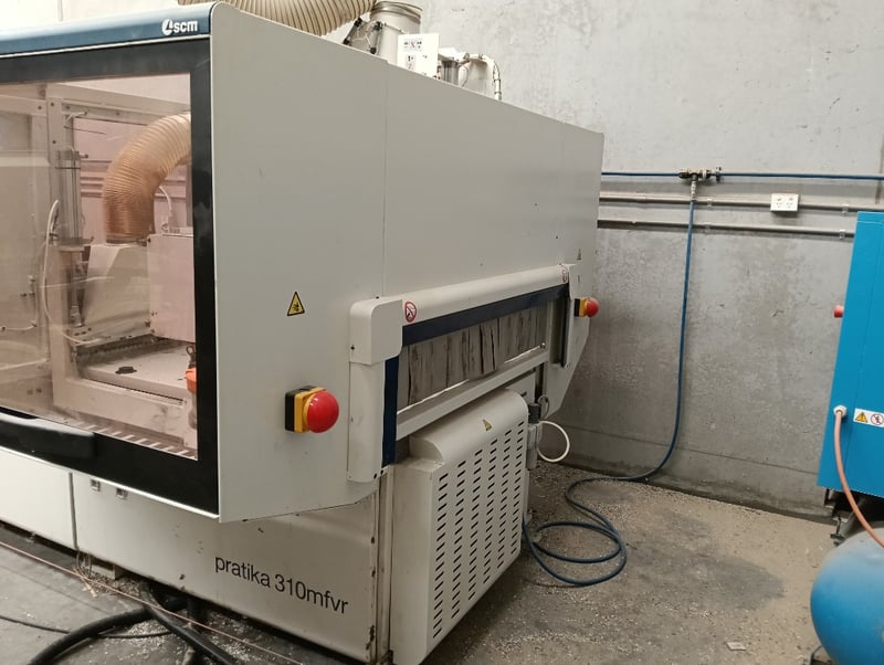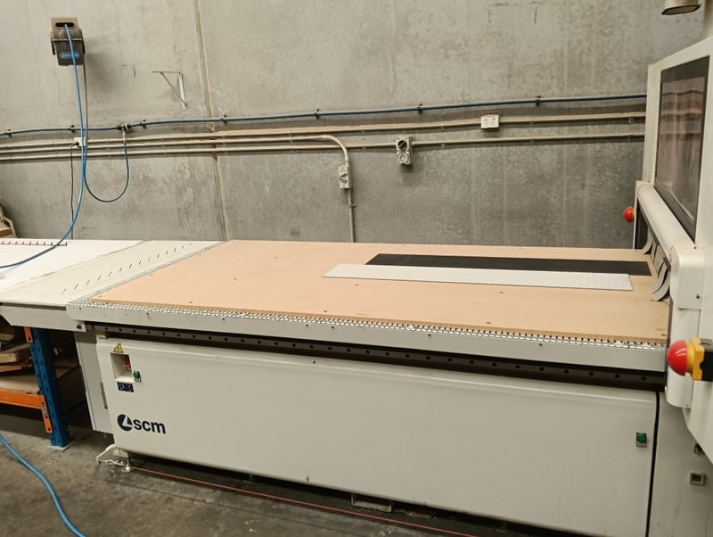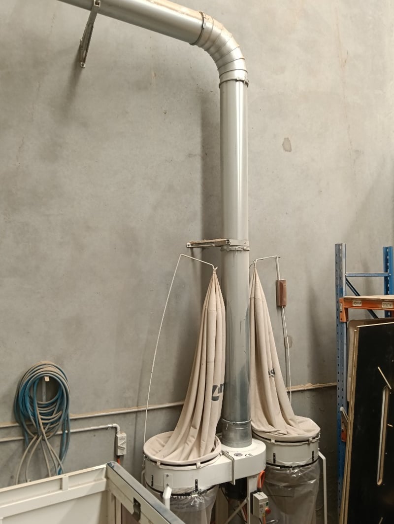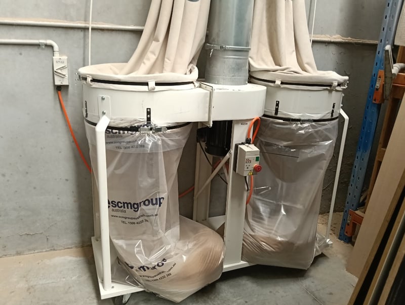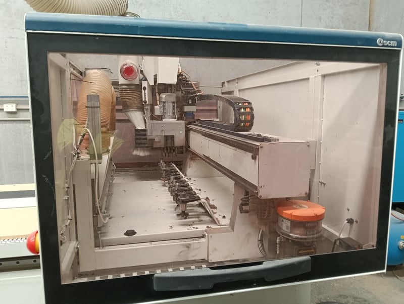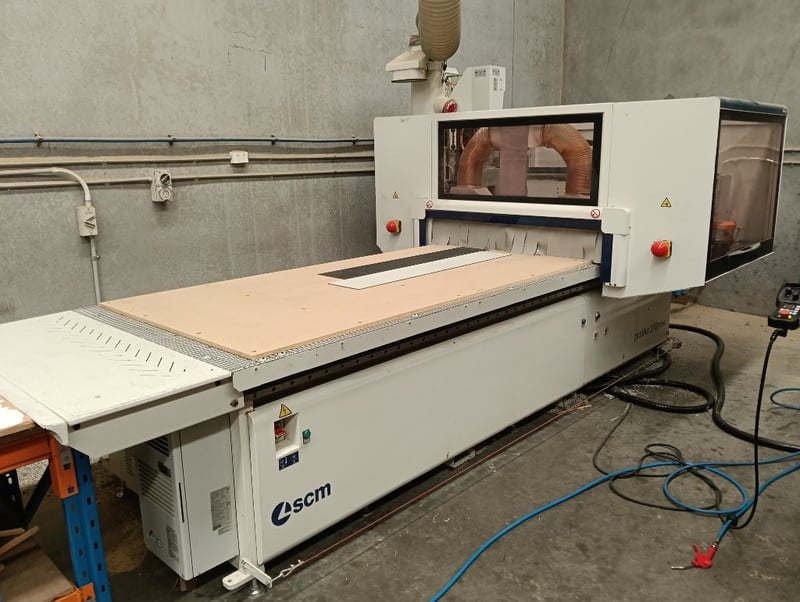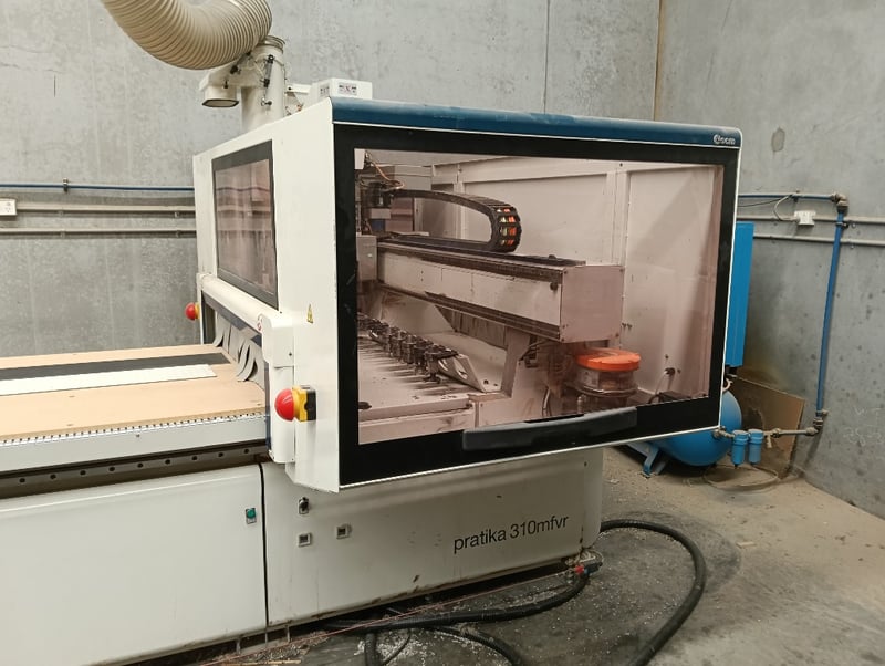 CNC Nesting Machining Centre, SCM Pratika 310mfvr, HSK F63 electro-spindle (2.2kW/3Hp, 4,000-8,000 RPM), integrated max. 100mm dia. blade unit, multiple drilling spindles vertical (7x spindles) and horizontal (2x spindles), 11-position tool changer, 3050mm x 1200mm max. panel working area, standalone CNC control console, pendant controller, DOM: 2018, S/N: BR1800260 with galvanised steel and flexible pipe exhaust to Unbranded twin bag mobile dust collector