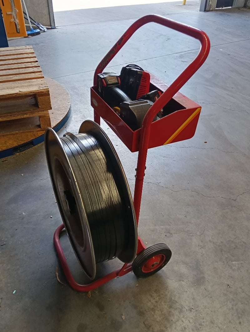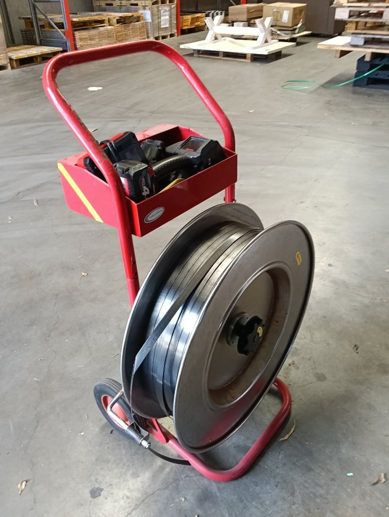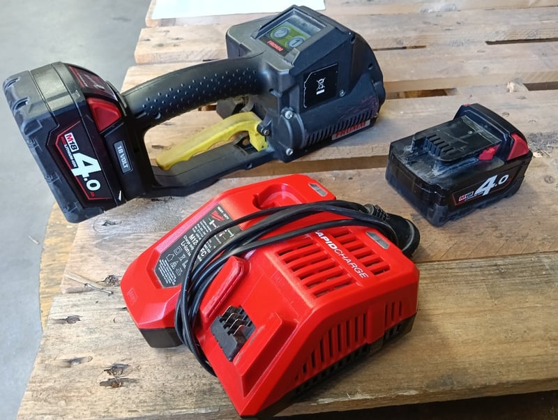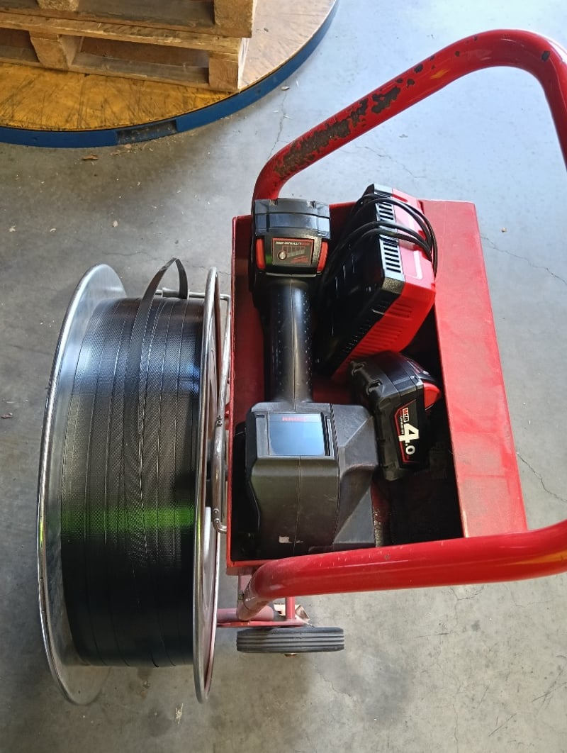 Strapping Kit, Red steel cart with tape dispenser, Fromm P329S cordless strapping tool, DOM: 2019, S/N: 0101836, Milwaukee RapidCharge M18 battery charger and 2x 4.0Ah li-ion batteries