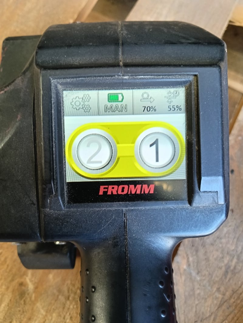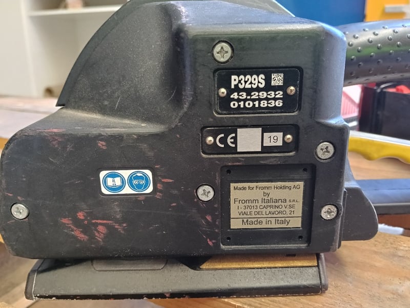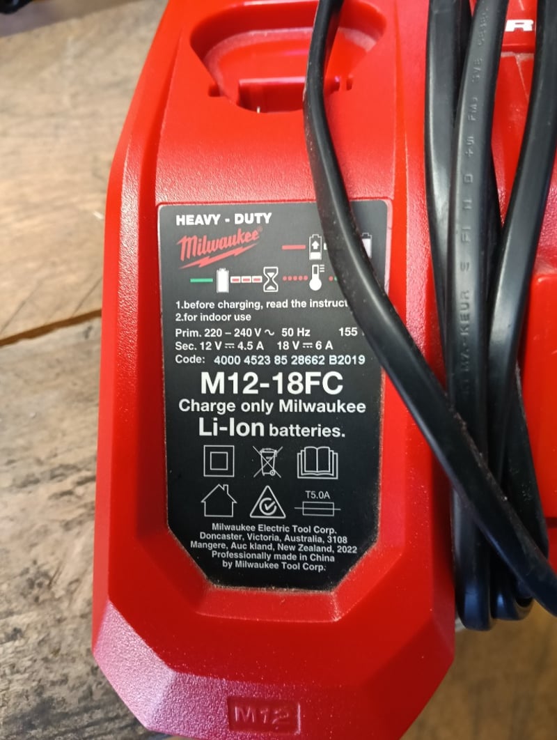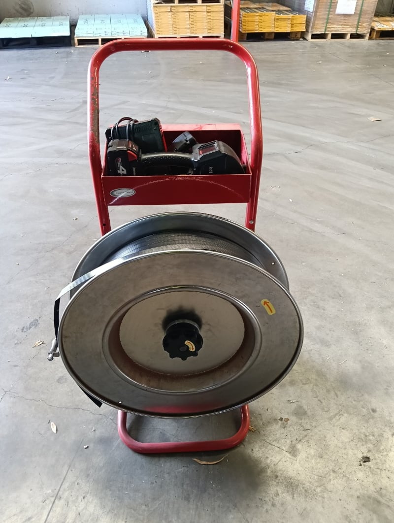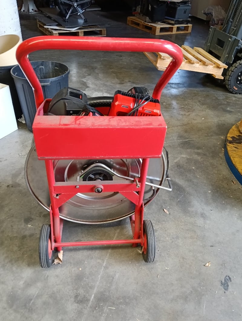 Strapping Kit, Red steel cart with tape dispenser, Fromm P329S cordless strapping tool, DOM: 2019, S/N: 0101836, Milwaukee RapidCharge M18 battery charger and 2x 4.0Ah li-ion batteries