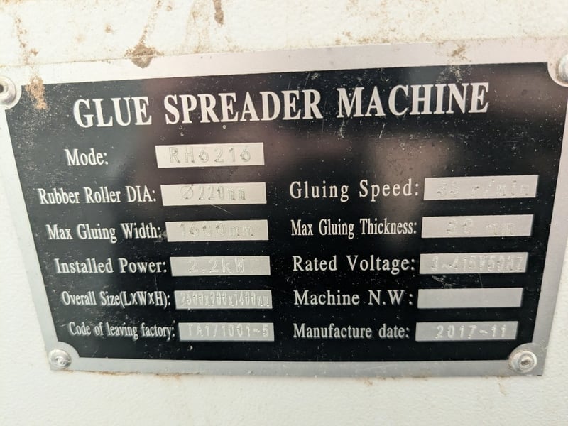 Glue Spreader, Rhino RH6216, 220mm roller dia., 2600mm (W), DOM: 11/17, ID: TA171001-5 Note: Untested