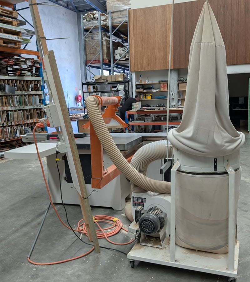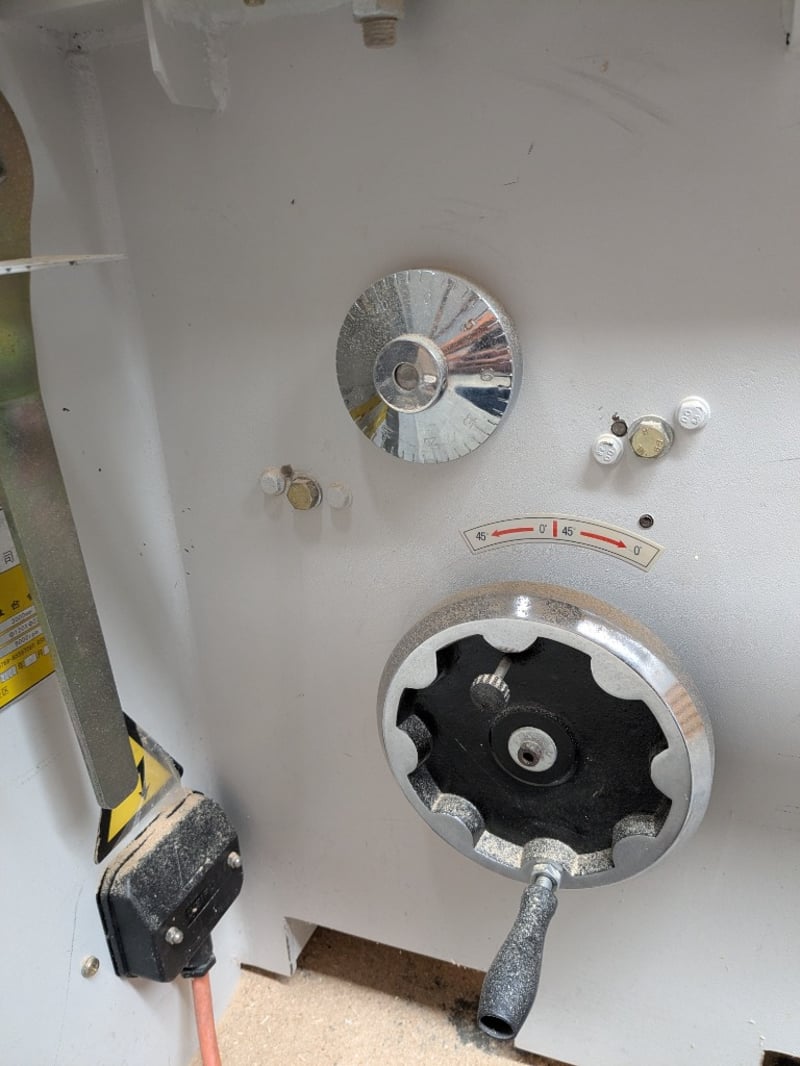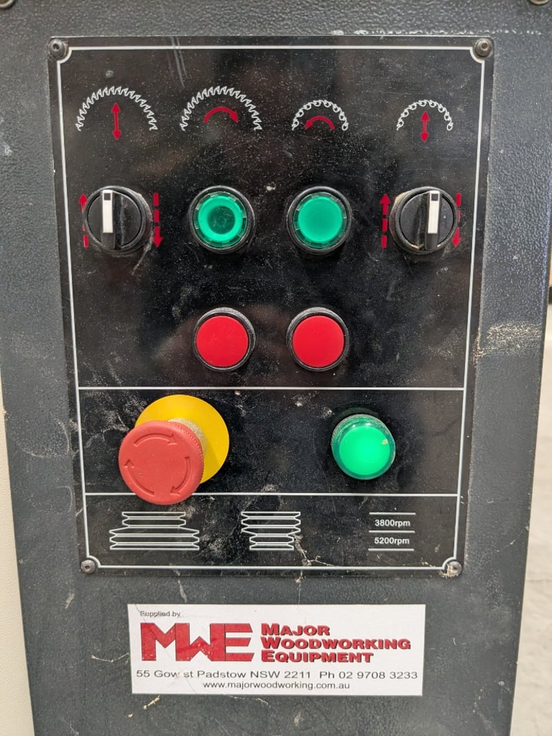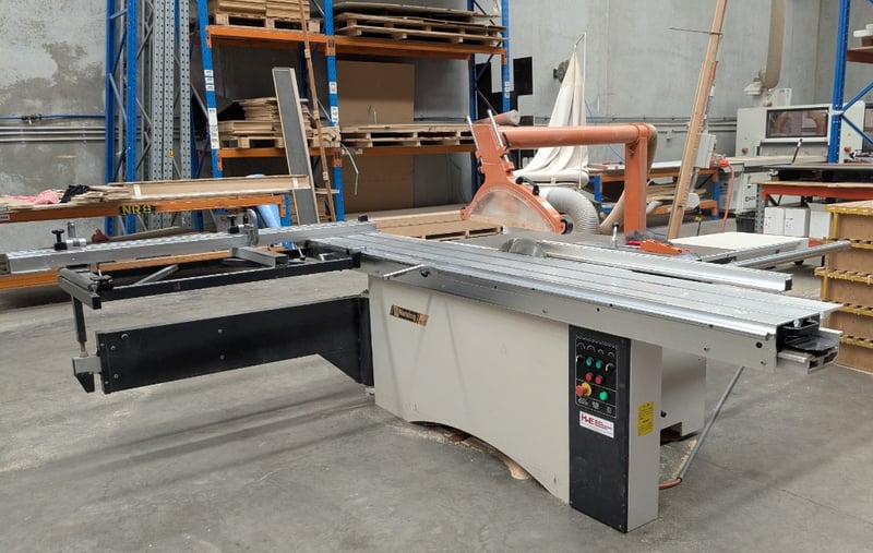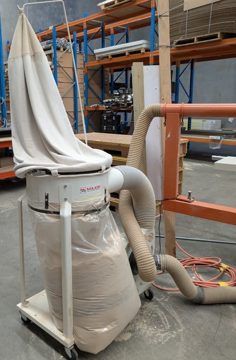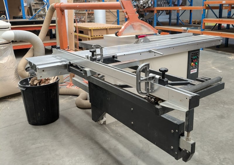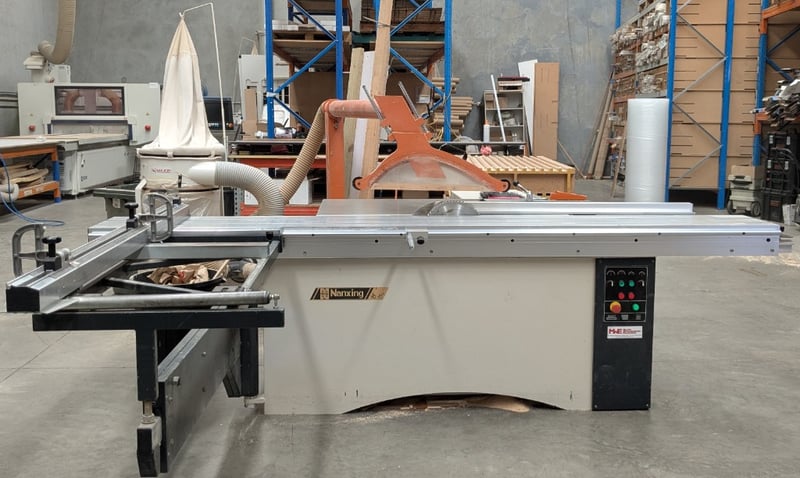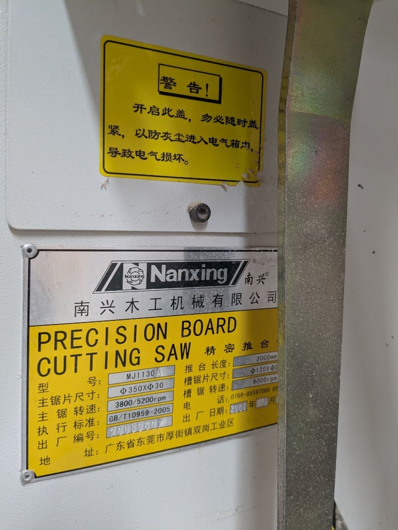 Sliding Table Panel Saw, Nanxing MJ1130A, 3000mm table, 350mm dia. blade and scribing blade with over-blade exhaust and guard, tilting arbour, crosscut fence with baffles, auxiliary work table and manual rip fence, DOM: 07/08, S/N: 20080607 with Major SF-001 single bag 2hp dust collector, DOM: 06/16, S/N: 162608
