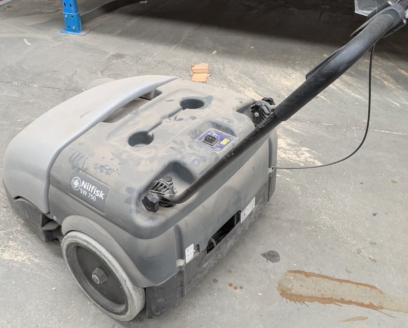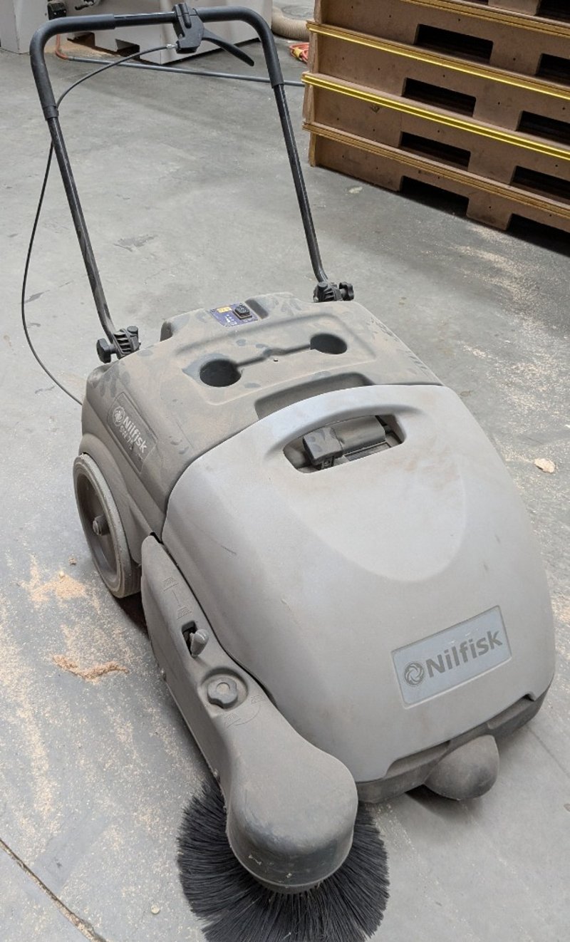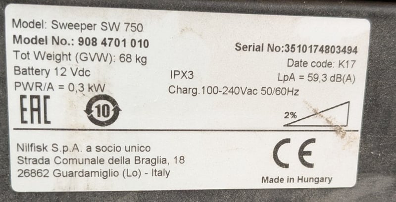 Factory Sweeper, Nilfisk SW750, walk-behind, battery electric, folding push arm, DOM: 2017, S/N: 3510174803494Note: Untested