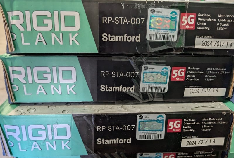 Rigid planks, Stamford design, matt embossed finish. 6 boards per carton, 24 cartons per lot. Refer to photo for dimensions and specifications.