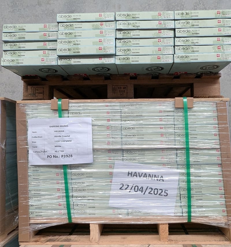 Rigid planks, Abode coastal, Havanna design, PUR matt embossed finish. 5 boards per carton, 83 cartons per lot.