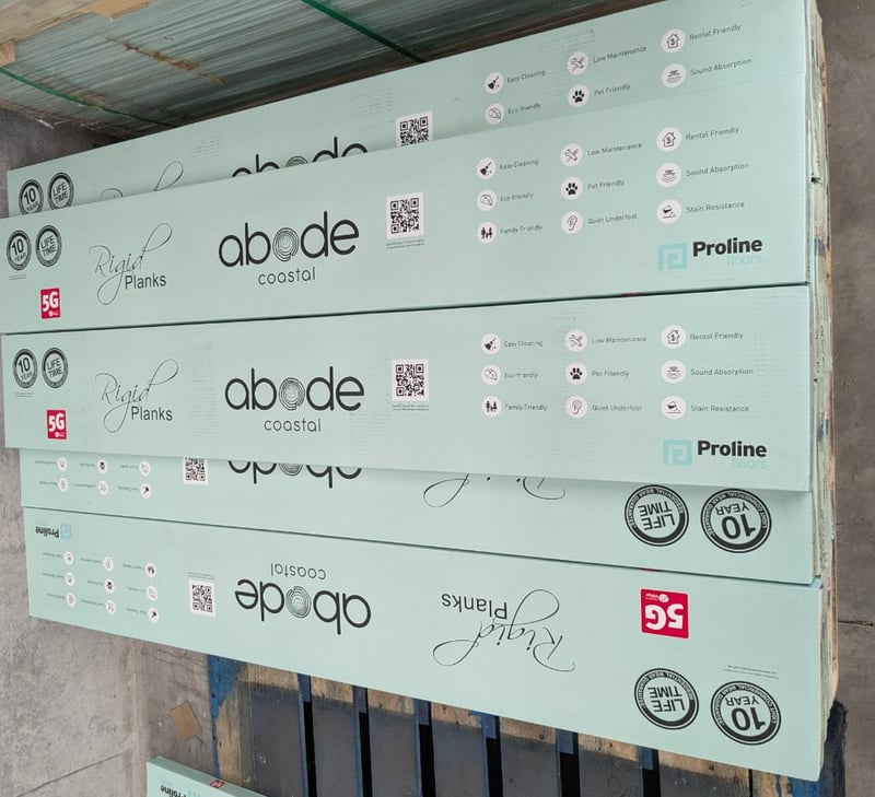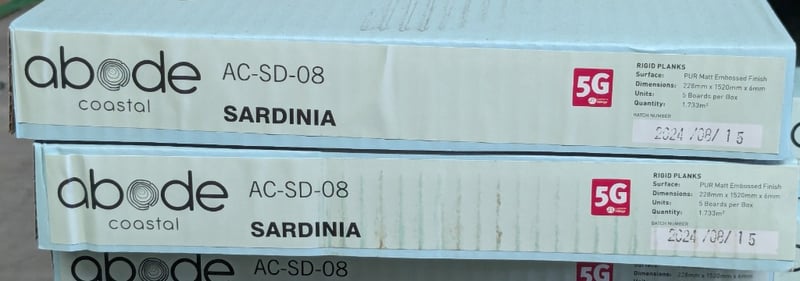 Rigid planks, Abode coastal, Sardinia design, PUR matt embossed finish. 5 boards per carton, 14 cartons per lot.