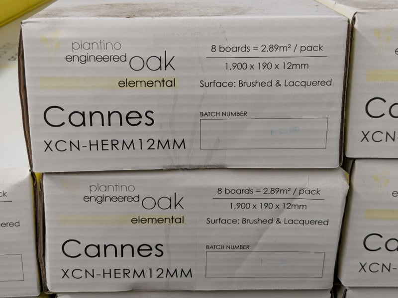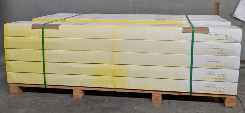 Plantino Engineered, Oak elemental, Cannes design, brushed and lacquered finish. 8 boards per carton, 24 cartons per lot.