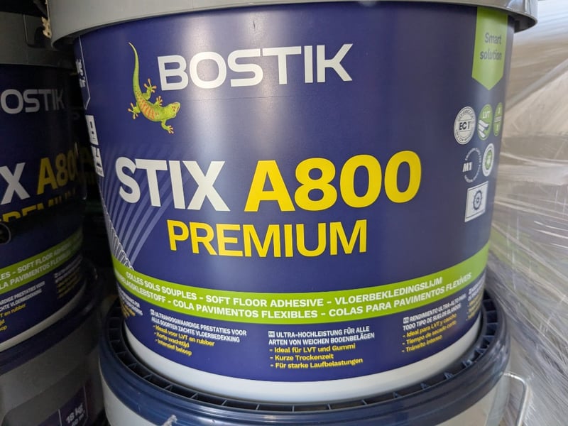 Bostik, stix A800 premium, 18 kilos = 60m2, 10 buckets per lot.Sold as a lot.