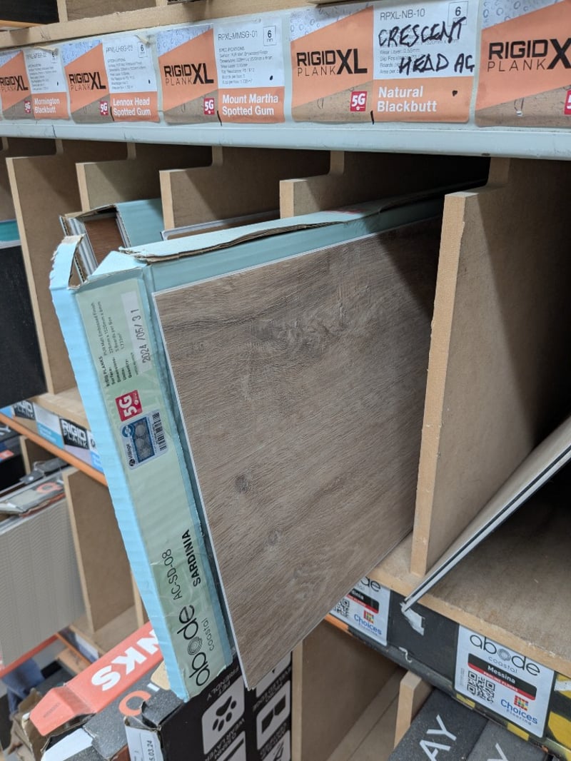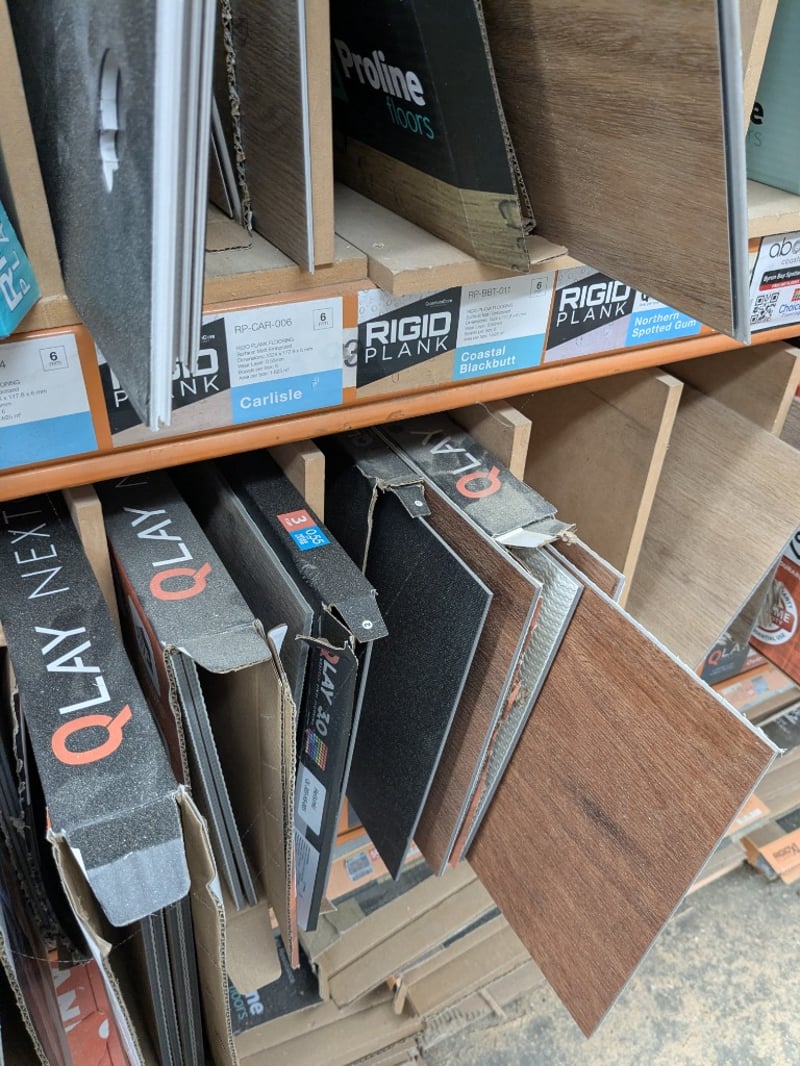 Flooring material samples included Rigio Plank XL, Mornington blackbutt, PUR Matt embossed finish, Rigio Plank XL, Desert willow, PUR Matt embossed finish and more...