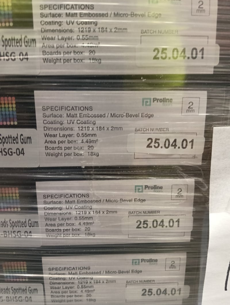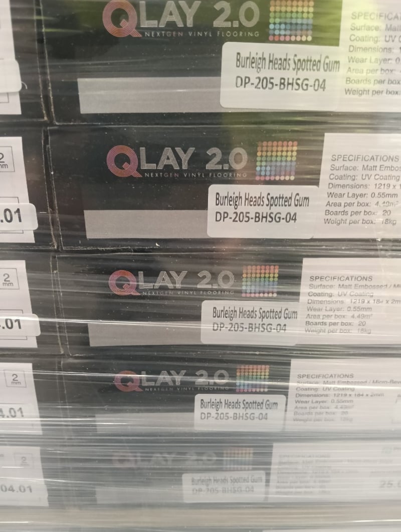 QLay 2.0 Vinyl Flooring, Matt Embossed/Micro-Bevel Edge, 20x Boards per Carton, Qty 45x Cartons of Burleigh. Heads Spotted Gum, Refer to photo for dimension & specifications