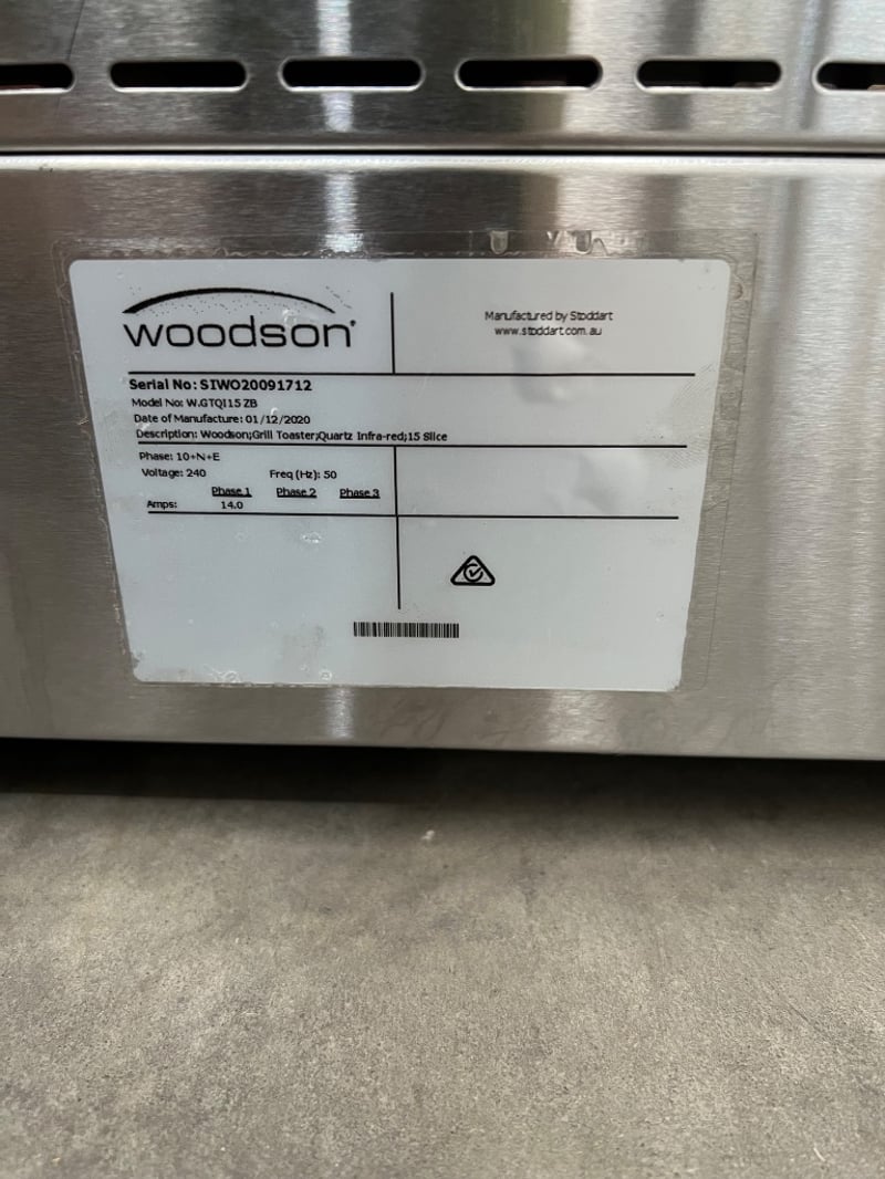 Toaster/ salamander, Woodson, W.GTQI152B, serial; SIW020091712, stainless steel, on counter Dimensions approx; 67W x 50D x 36H cm