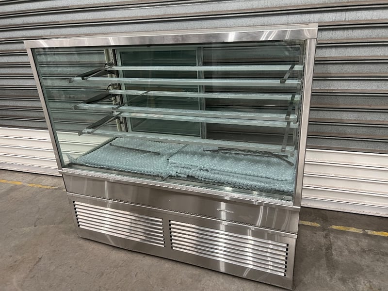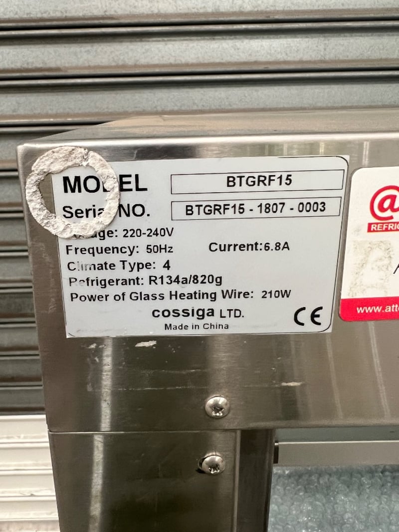 Cake display/ refrigerator, COSSIGA, BTGRF15, serial; BTGRF15-1807-0003, glass doors, stainless steelDimensions approx; 150W x 74.5D x 137.5H cm