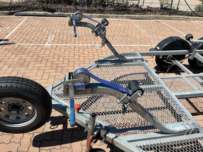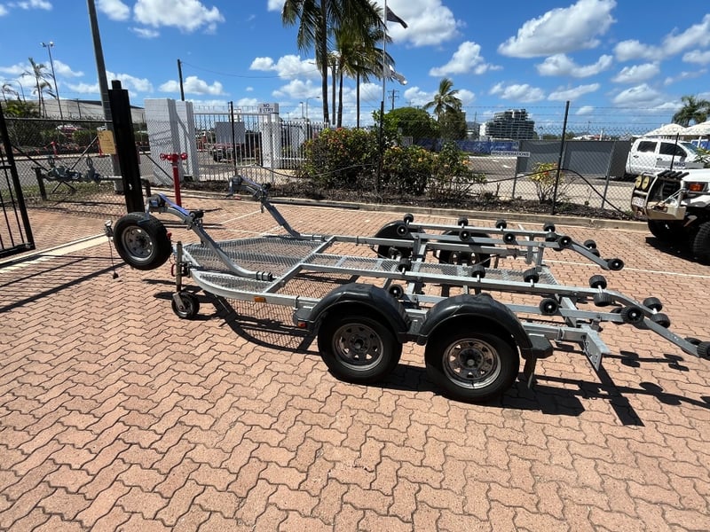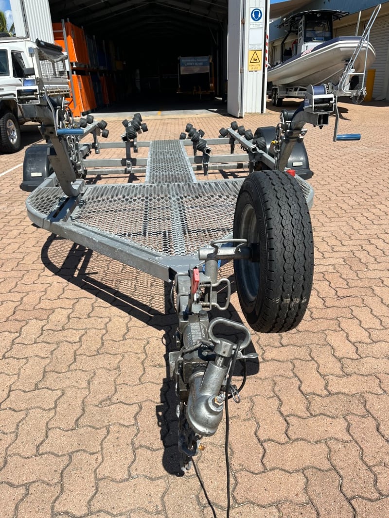Description: Galvanised dual axle steel twin jetski trailer, mounted spare wheel, overrider disc brakes on from wheel, full multi roller, 7 pin flat tail light plug