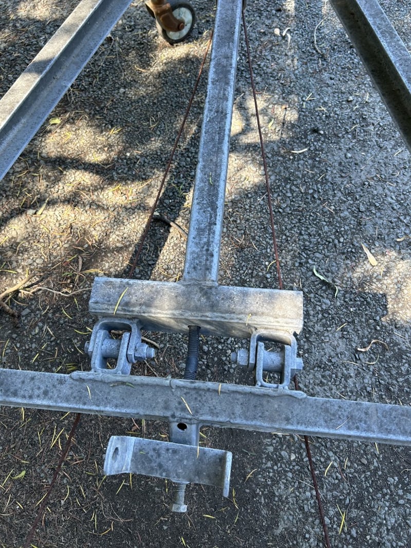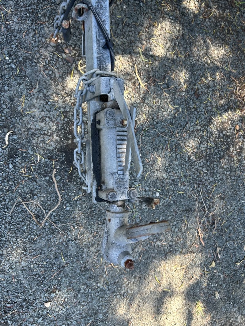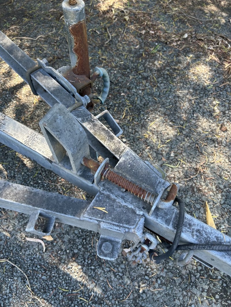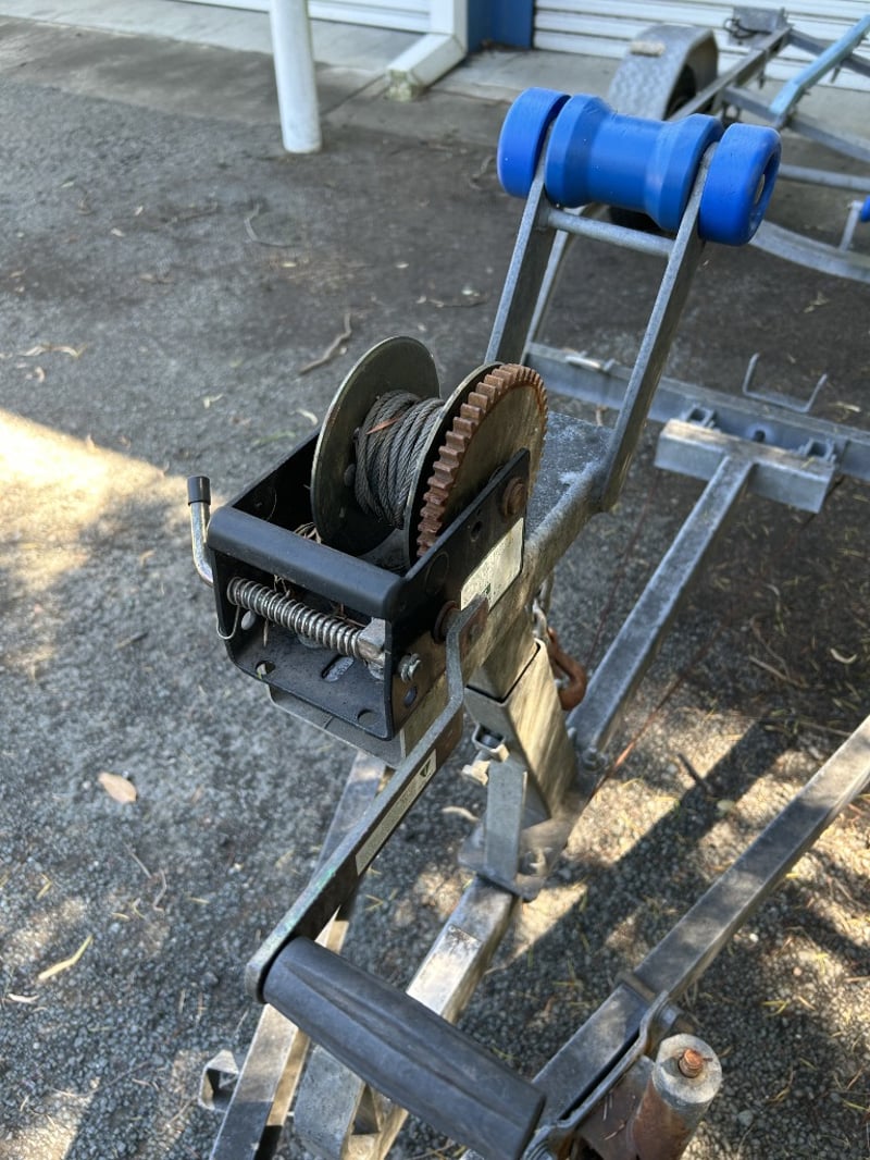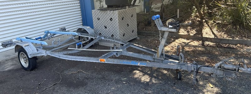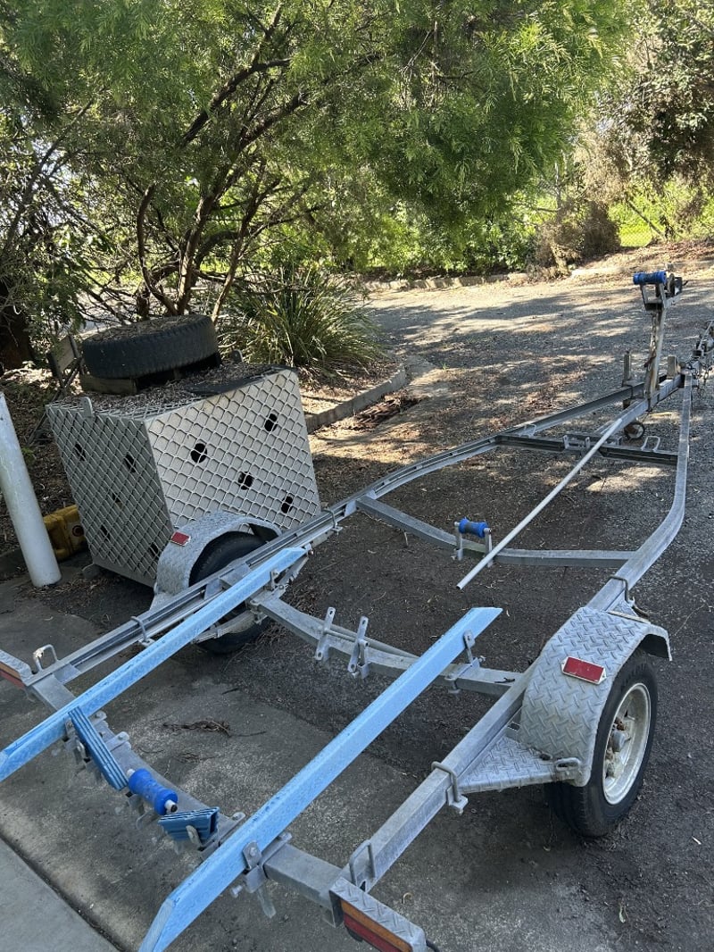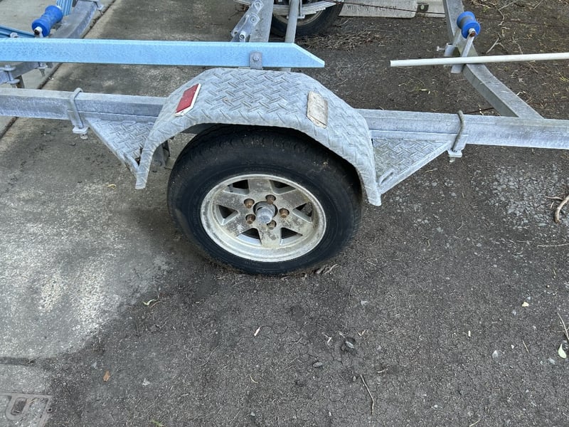 Description: Galvanised single axle steel boat trailer suitable for boats up to 4m, structurally sound, some nylon rollers are missing, general wear and tear to components.