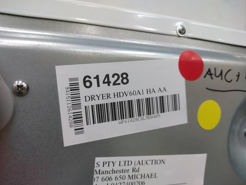 RRP: $579, Haier, 6kg 300 Series Sensor Vented Dryer Sensor drying Reverse tumble action Approximate Dimensions: H 83cm x W 60cm x D 58.5cm Model: HDV60A1 Disclaimer: These Lots Are Being Offered As A Refurbished Item. Refurbished Items Often Present As Used, And Therefore Be Subject To General Cosmetic Wear & Tear. Original Equipment Manufacturer Images Are Stock Photos To Be Used As A Guide Only. Inspection Is Highly Recommended.