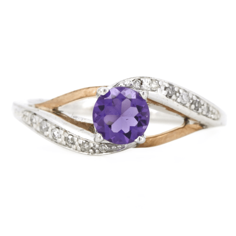 9K ROSE GOLD/STERLING SILVER, AMETHYST AND DIAMOND, DRESS RING.