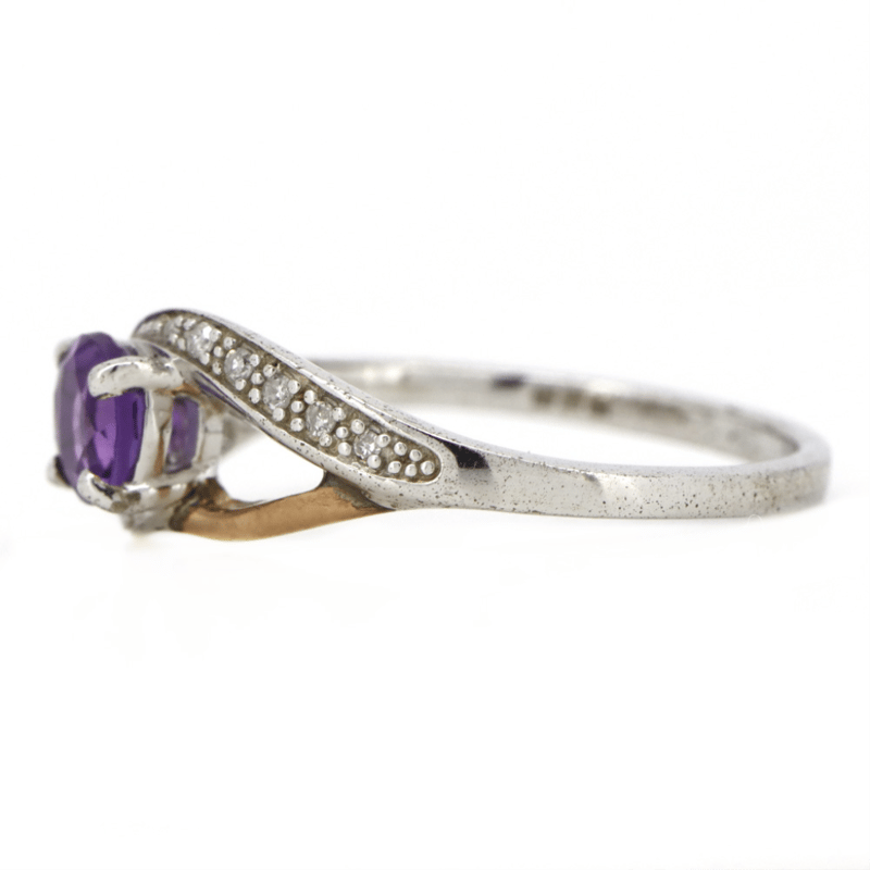 The Centre Features, One Round Faceted Cut, Purple, Amethyst (0.40Ct, Eye Clean Clarity), 4 Claw Set. Decorating The Split Band Are, 12 Round Single Cut, Diamonds (0.06Ct Tdw, H-J, Si-P1), Bead Set. Ring Size N.