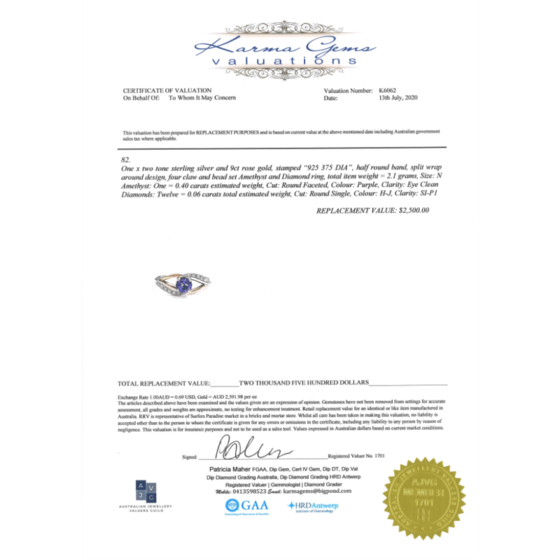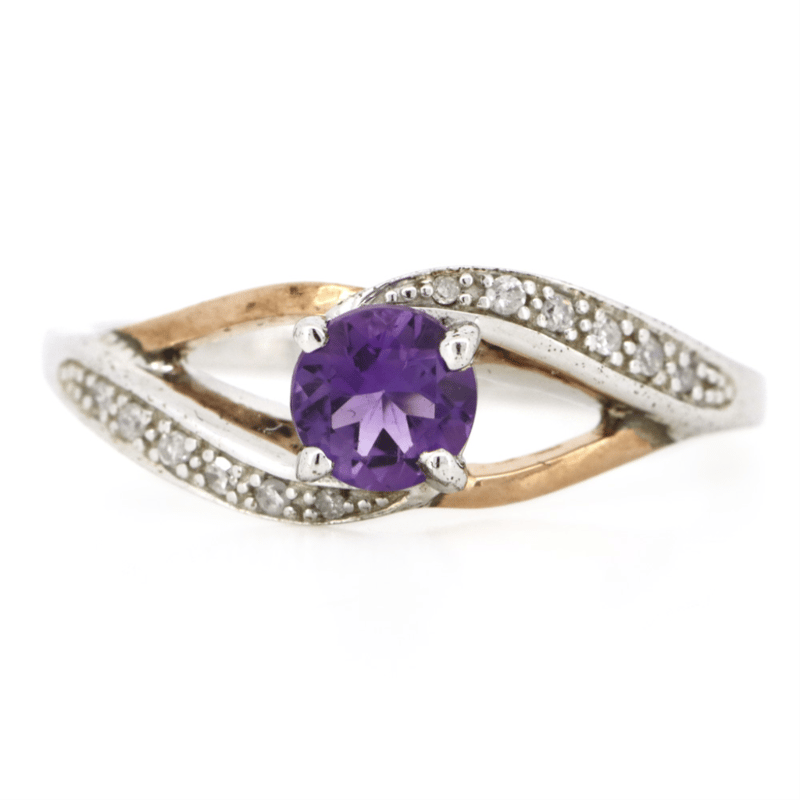 9K ROSE GOLD/STERLING SILVER, AMETHYST AND DIAMOND, DRESS RING.