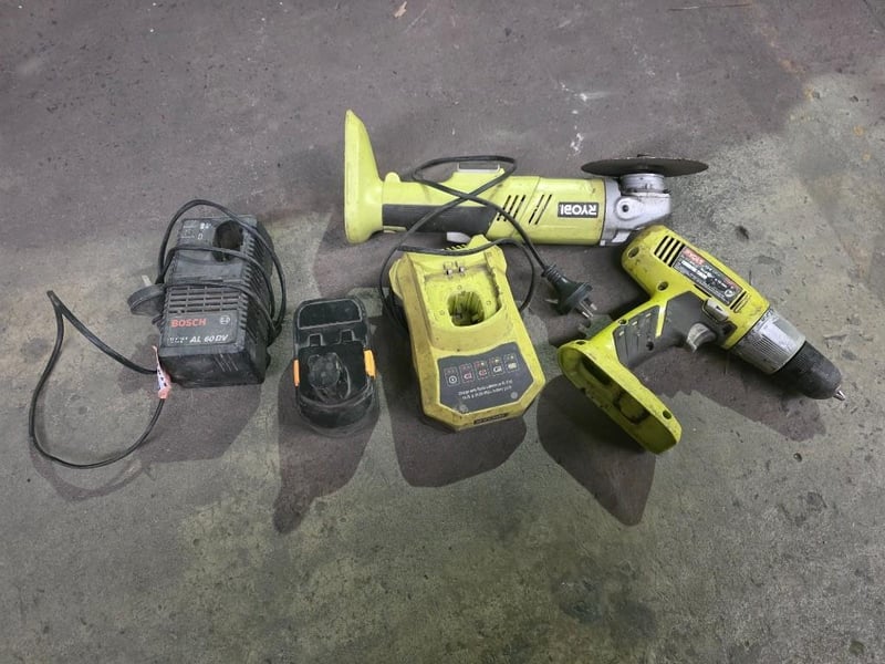 Ryobi tool bundle including battery, charger, grinder, drill and a bosch chargerSold as lot