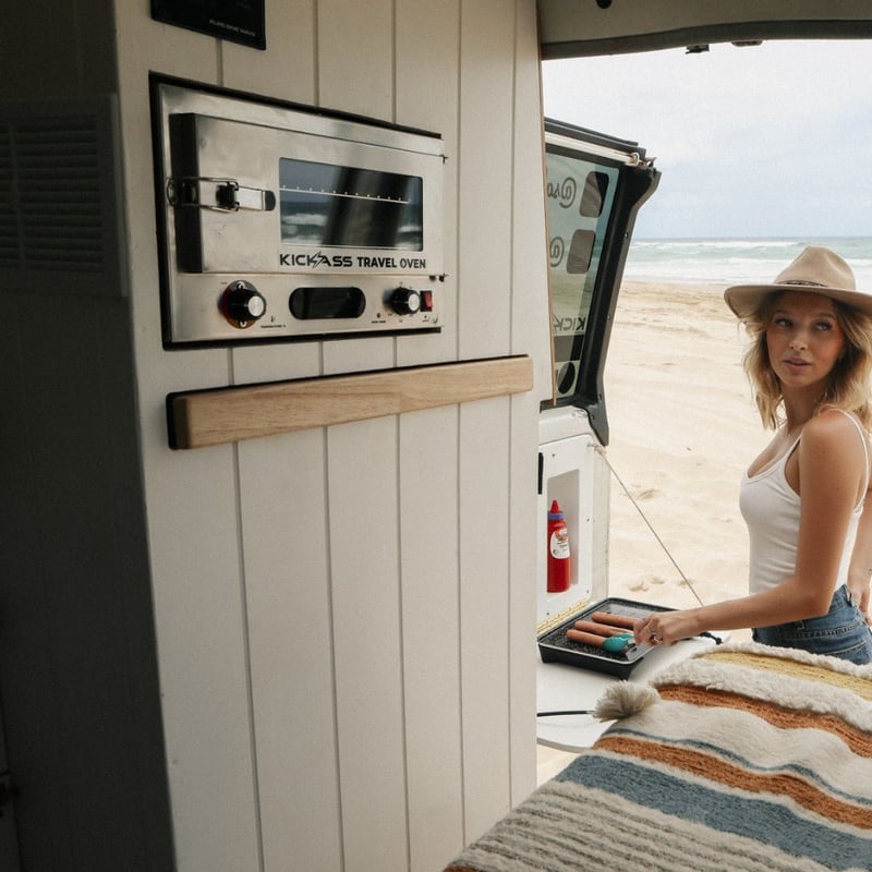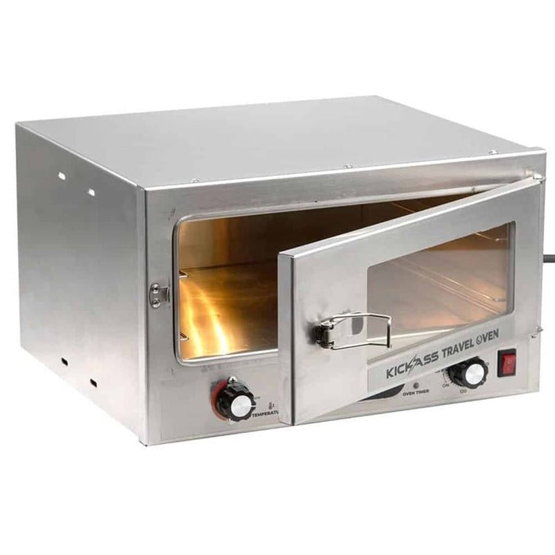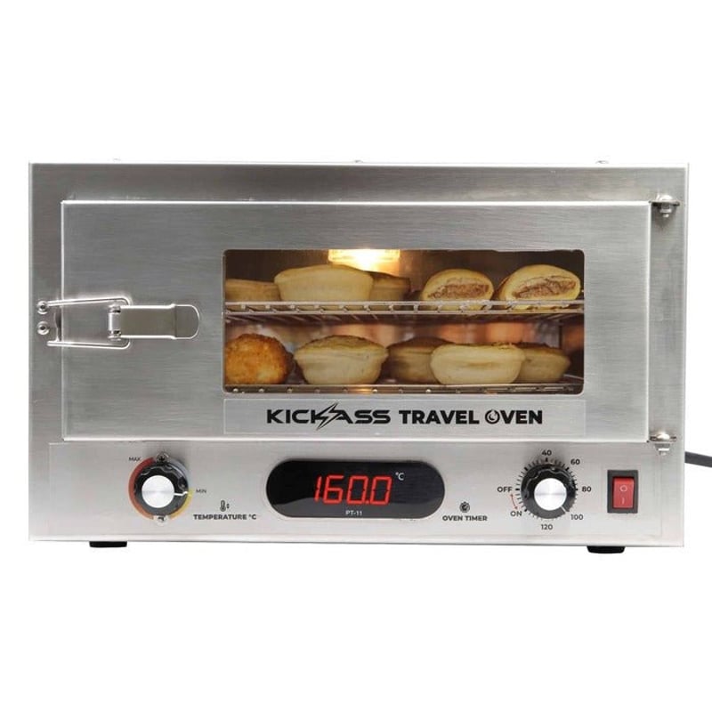 RRP$299.95 12V 130W Portable Travel Oven with Glass Door Specifications:Current: 10.8 AWattage: 130 W MAXTemperature Range: 180 °C MAXOven Timer: 1–120 minutes (toggle override switch for unlimited cooking time)Replaceable Fuse Rating: 15 AInsulation: FiberglassCasing: 304 Stainless Steel