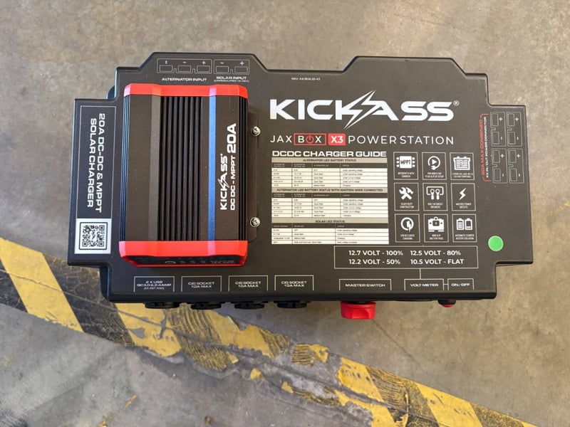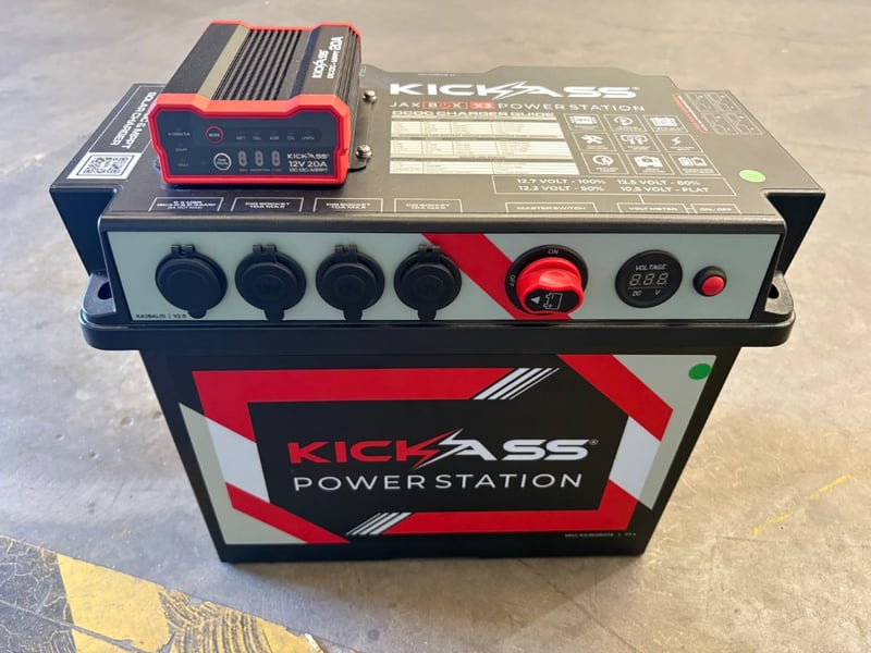 RRP$630 Portable Battery Box Power Station with Integrated 20A DCDC Charger - JAX BOX X3 This unit is completely pre-wired and includes a 20A DCDC charger to keep your battery charged, 4x Anderson style connectors, 2x USB ports & 3x 12V sockets. Battery Not Included.