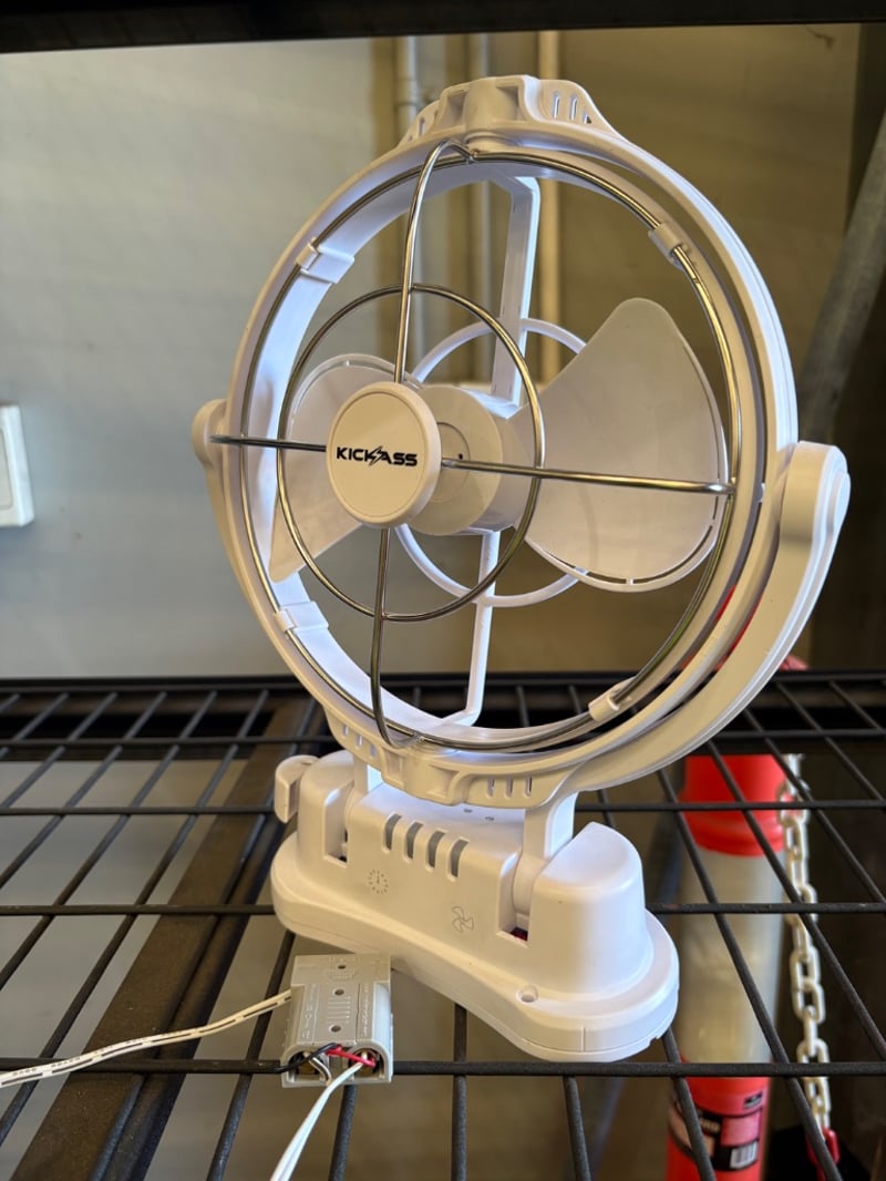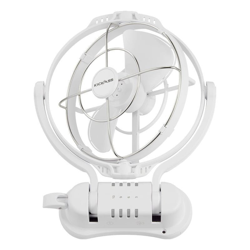 RRP$129 -12V / 24V 360°, 3 Speed Caravan Fan - White KickAss 12V / 24V 360° Three-Speed Fan – designed for permanent installation in caravans, motorhomes, sheds and more. With ultra-quiet operation, full 360° airflow, low power draw and auto-sensing voltage, it’s the perfect off-grid cooling solution that locks in place and folds away flat when not in use.