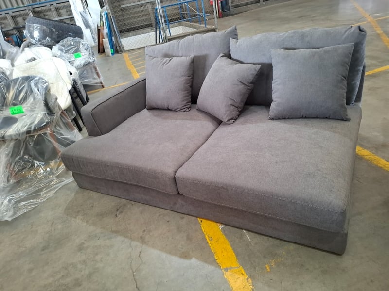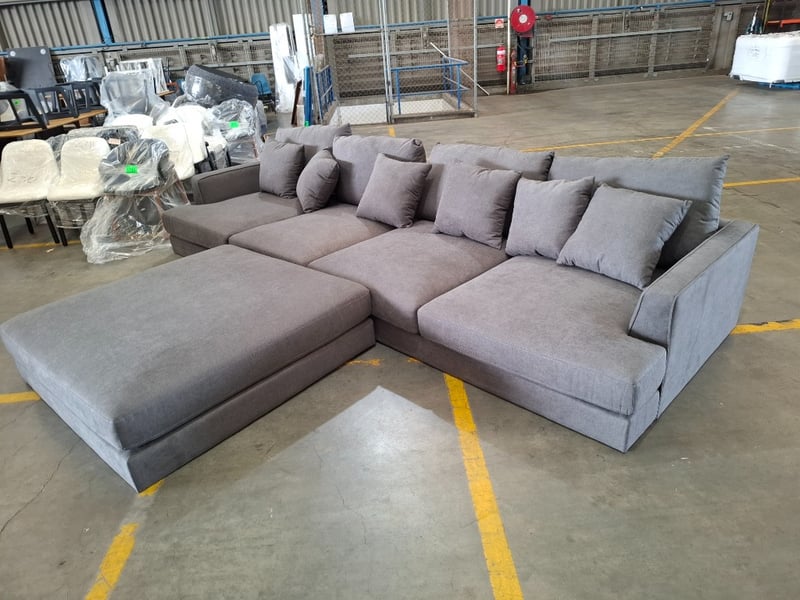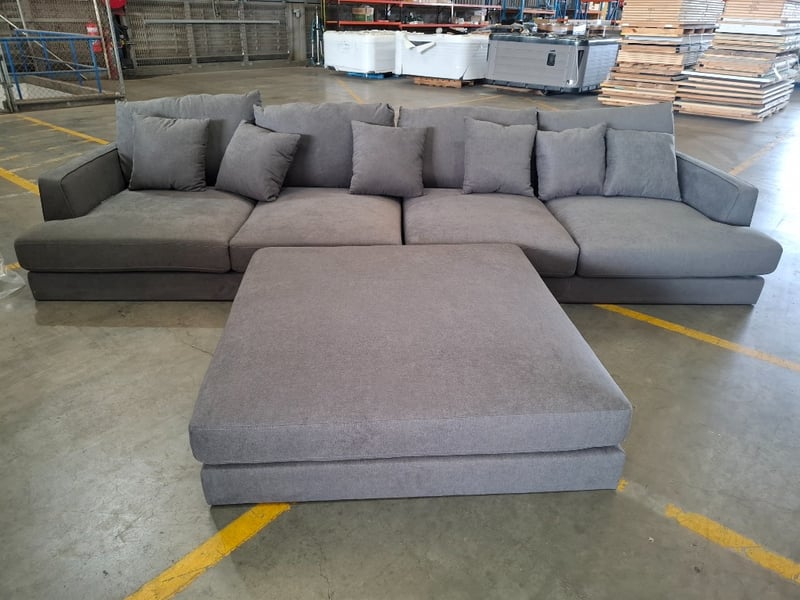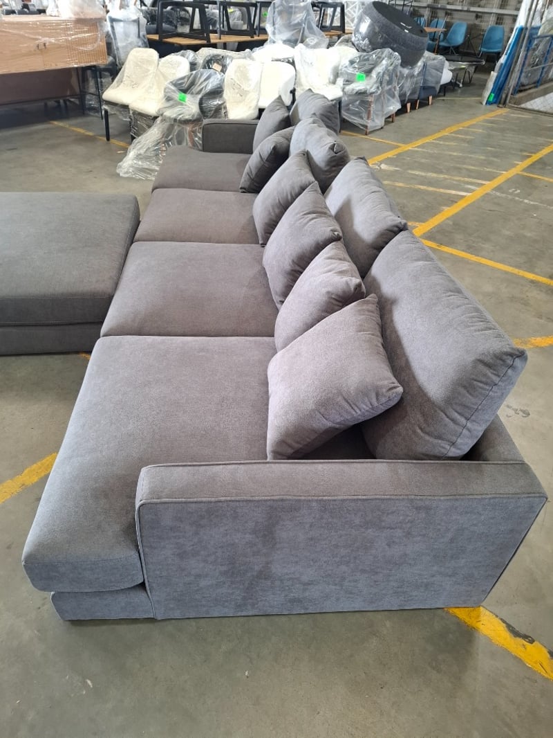 4 seats lounge suite with ottoman, fabric charcoal colour Dimensions:375 cm (W) x 127cm (D) x 85cm (H)Note: DISASSEMBLED, FEET INCLUDED