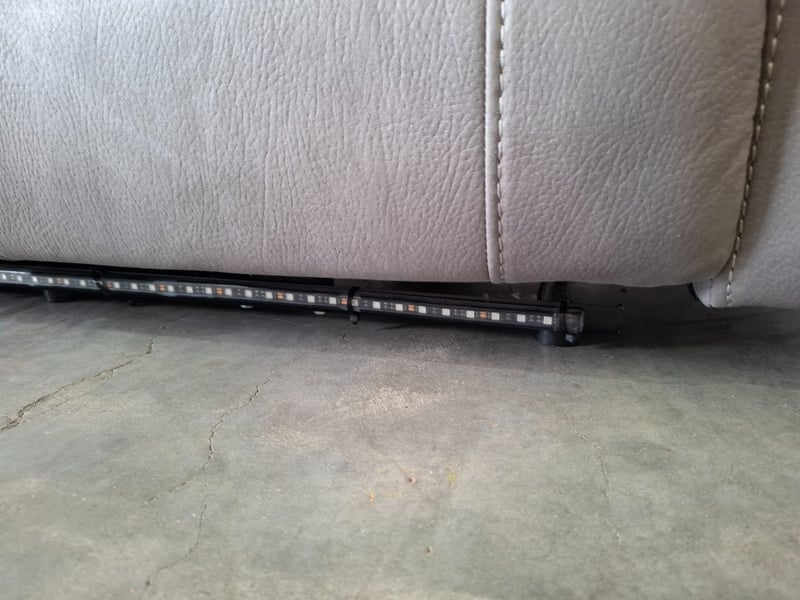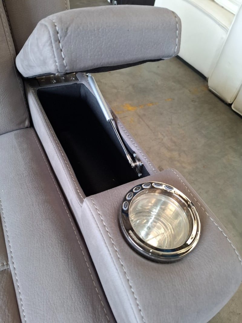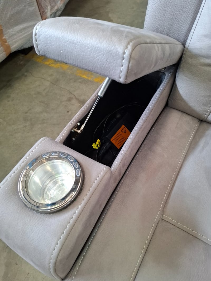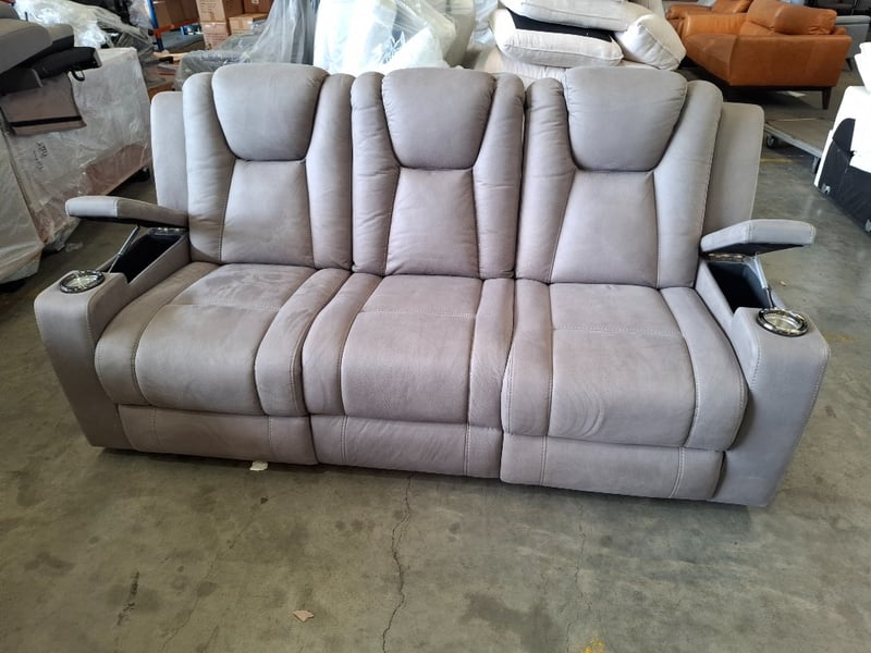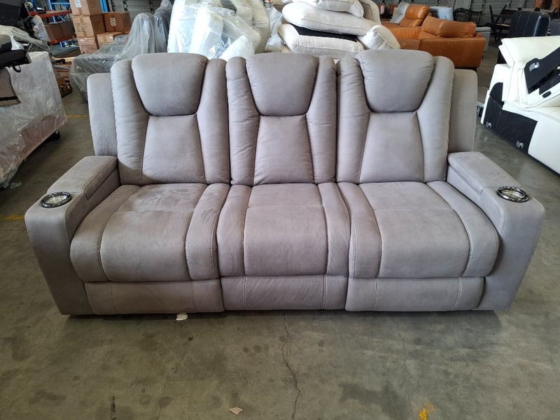 3 seater electric recliner, ash colour fabric, 2 cup holders, 2 storage compartments, Led lights Dimensions: 210 cm ( W)x 80 cm ( D) x cm ( H)