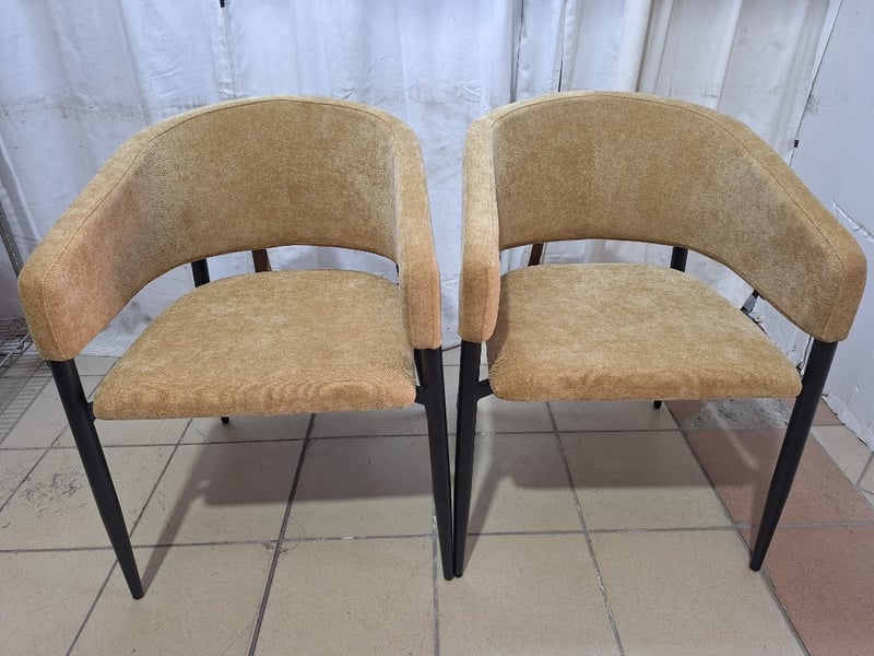 Pair Of Lounge Chairs With Cushions, Timber & Fabric Style, Yellow Finish Dimensions H:79cm W:55cm D:49cm SOLD AS LOT