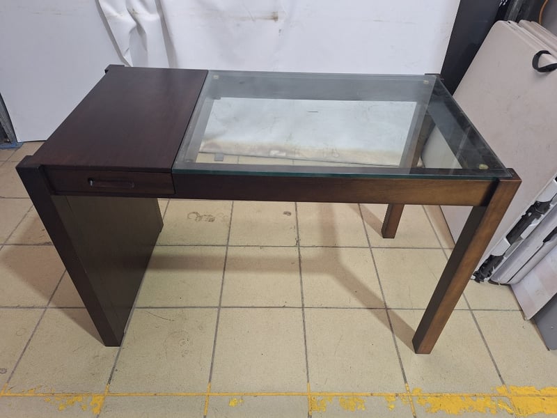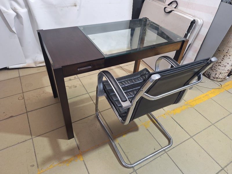 Small Desk Table With Glass Top & Chair, Timber Style, Brown & Black Finish