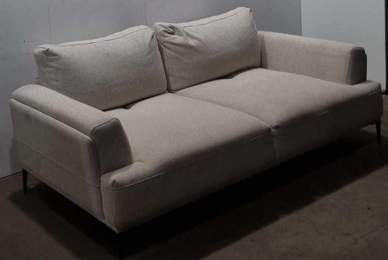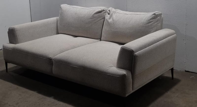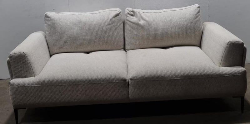 2 seater lounge, Upholstered, Cream, Aluminum legs, Shifting back/headrestDimensions: (H)85cm x (W)205 x (D)115cmNote, Signs of wear