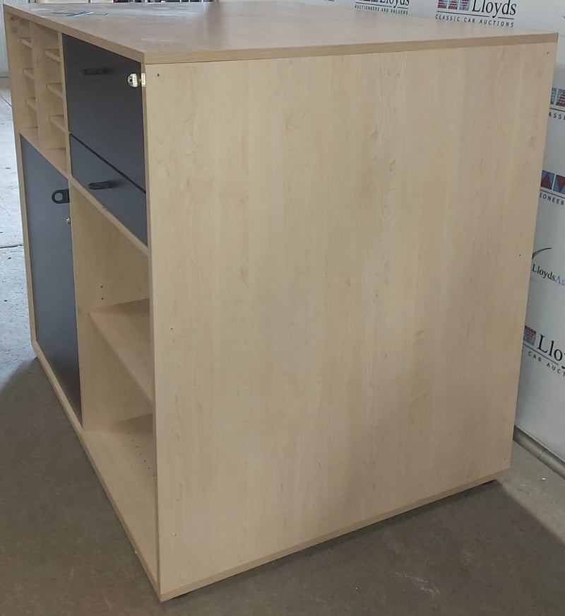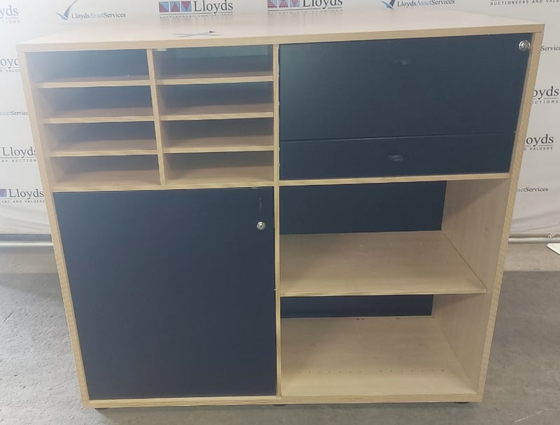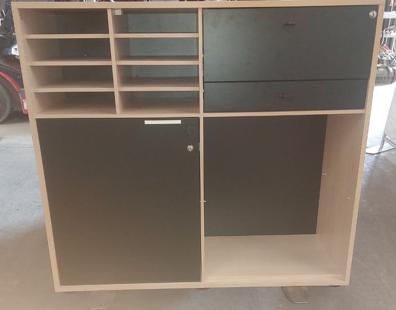 .Office storage cabinet, plywood and black laminate,multiple cabinets and shelves.