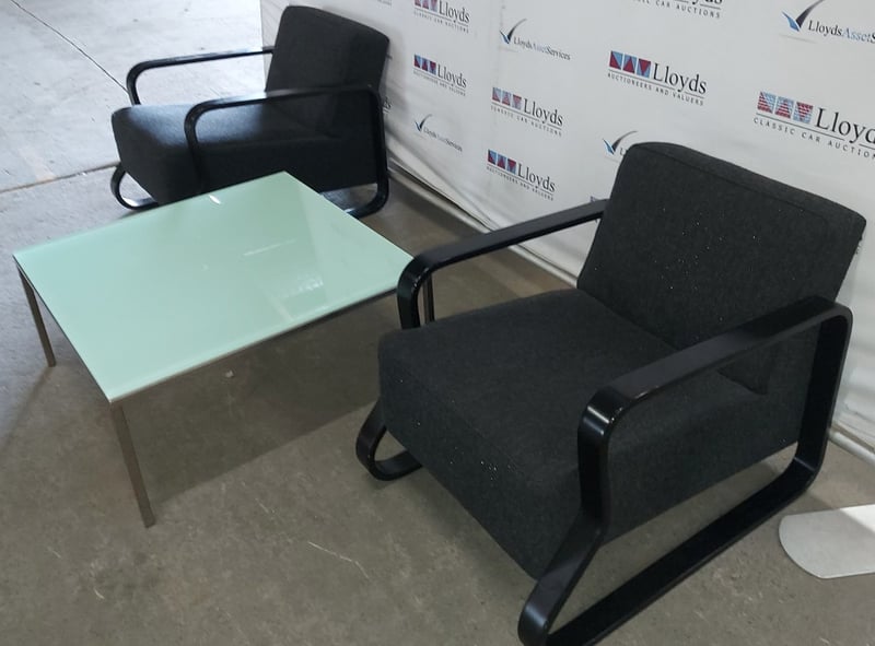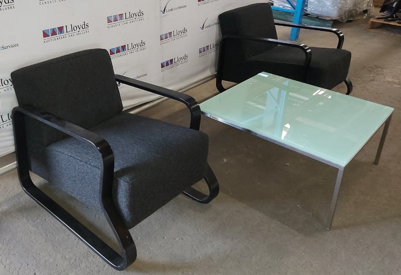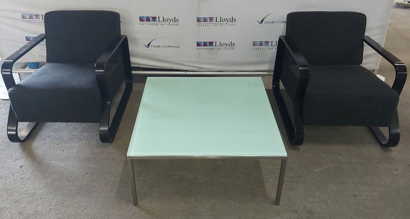 Lounge chairs with black covers, includes glass table with aluminium legs.Dims black chairs: 64 x 62 x 80cmDims glass table: 35 x 76 x 76cmNote: signs of wear and tear. Sold as a lot.