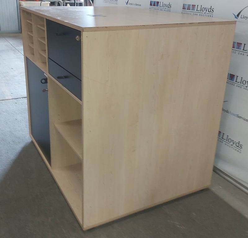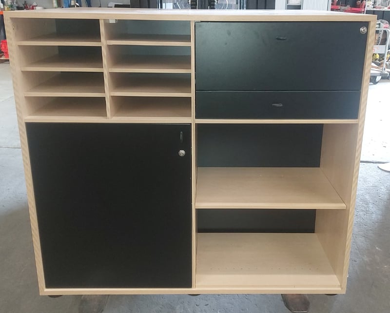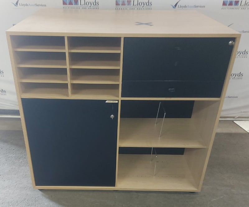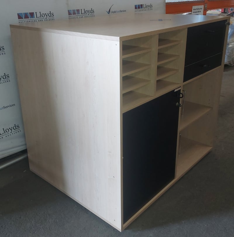 .Office storage cabinet, plywood and black laminate,multiple cabinets and shelves. Dims 107 ×120 ×90cm.Note wear and tear, keys included