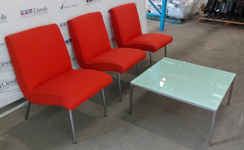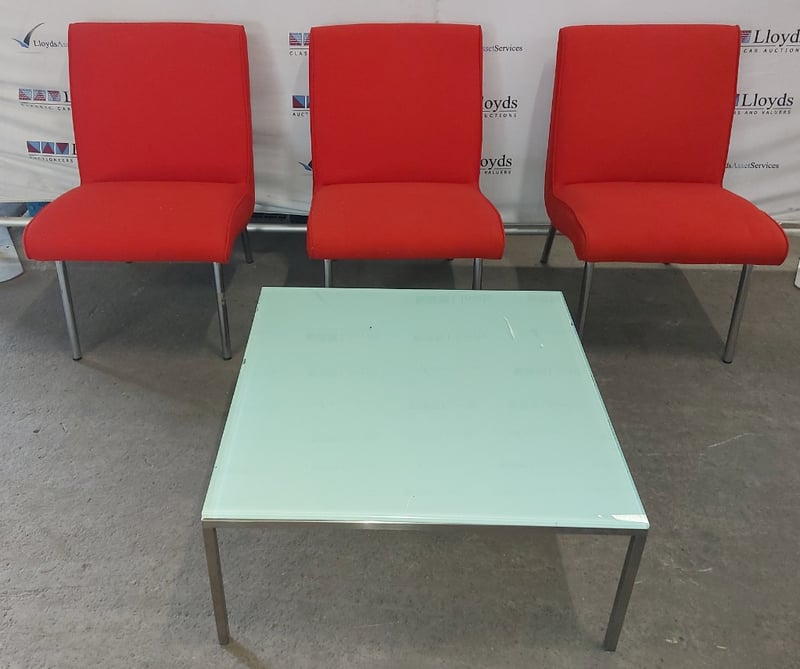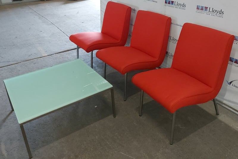 Chair set in red upholstery with cast aluminium legs, includes glass table with aluminium legs.Dims red chairs: 80 x 52 x 75cmDims glass table: 35 x 76 x 76cmNOTE: Signs of wear and tear.Sold as a lot.