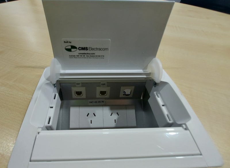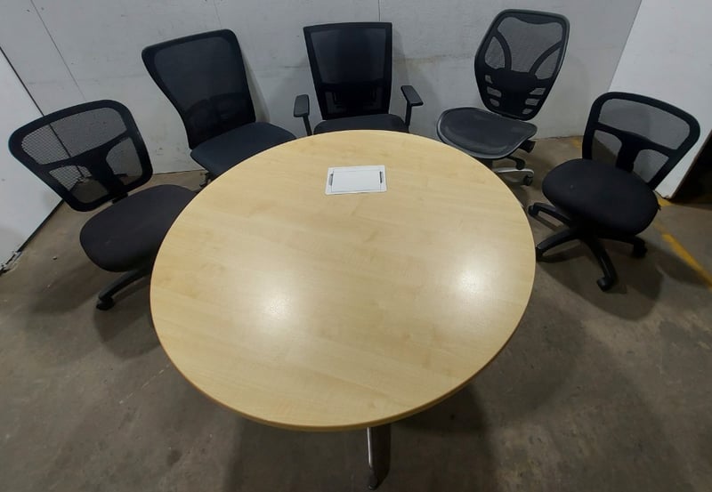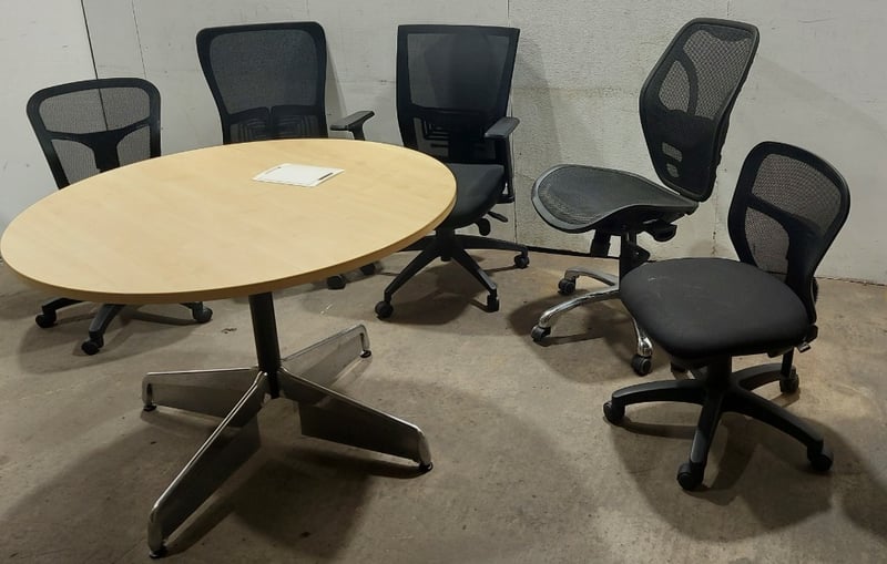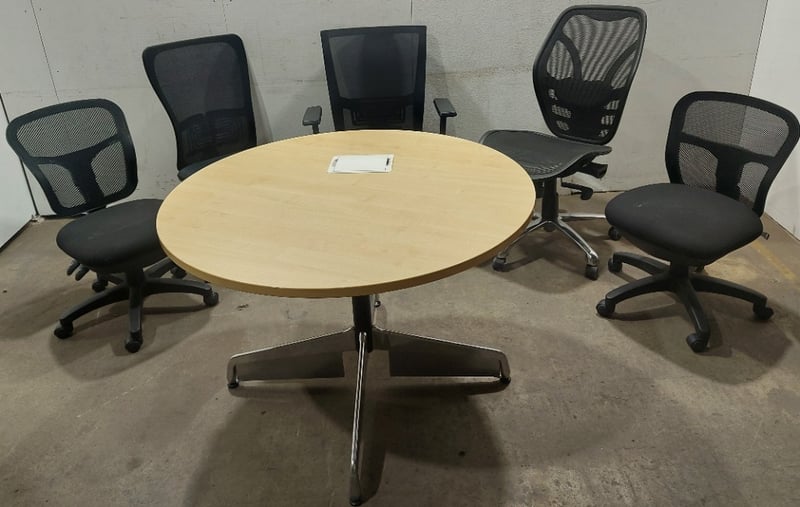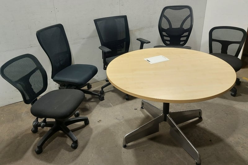 Office table, round, timber like,metal legs, with computer outlet, Includes variety of office chairs, black and on castors.